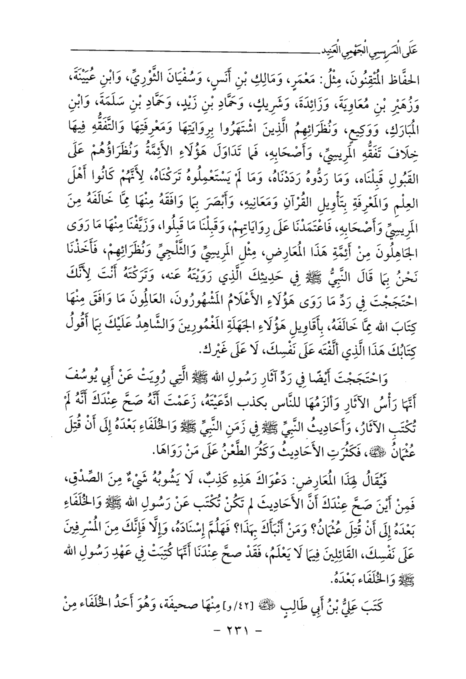 وَاحْتَجَجْتَ أَيْضًا فِي رَدِّ آثَارِ رَسُولِ الله - صلى الله عليه وسلم - الَّتِي رُوِيَتْ عَنْ أَبِي يُوسُفَ أَنَّهَا رَأْسُ الآثَارِ وَألزَمُهَا للنَّاس بكذب ادَّعَيْتَهُ، زَعَمْتَ أَنَّهُ صَحَّ عِنْدَكَ أَنَّهُ لَمْ تُكْتَبِ الآثَارُ، وَأَحَادِيثُ النَّبِيِّ - صلى الله عليه وسلم - فِي زَمَنِ النَّبِيِّ - صلى الله عليه وسلم - وَالخُلَفَاءِ بَعْدَهُ إِلَى أَنْ قُتِلَ عُثْمَانُ - رضي الله عنه -، فَكَثُرَتِ الأَحَادِيثُ وَكَثُرَ الطَّعْنُ عَلَى مَنْ رَوَاهَا.