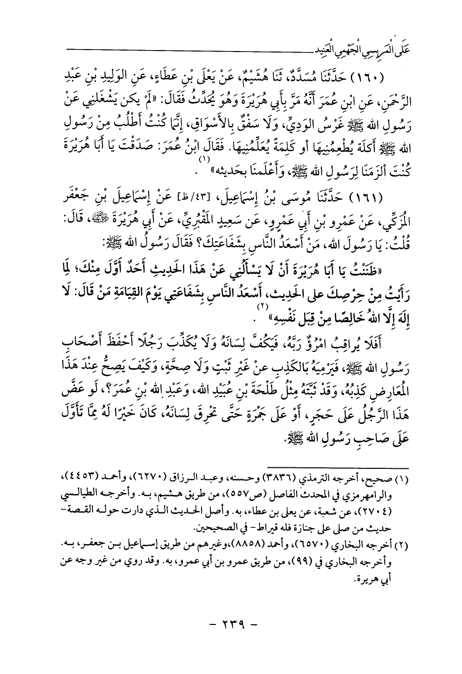 (160) حَدَّثَنَا مُسَدَّدٌ، ثَنَا هُشَيْمٌ، عَنْ يَعْلَى بْنِ عَطَاءٍ، عَنِ الوَلِيدِ بْنِ عَبْدِ الرَّحْمَنِ، عَنِ ابْنِ عُمَرَ أَنَّهُ مَرَّ بِأَبِي هُرَيْرَةَ وَهُوَ يُحَدِّثُ فَقَالَ: «لَمْ يكن يَشْغَلنِي عَنْ رَسُولِ الله - صلى الله عليه وسلم - غَرْسُ الوَدِيِّ، وَلَا سَفْقٌ بِالأَسْوَاقِ، إِنَّمَا كُنْتُ أَطْلُبُ مِنْ رَسُولِ الله - صلى الله عليه وسلم - أَكلَة يُطْعِمُنِيهَا أو كَلِمَةً يُعَلِّمُنِيهَا. فَقَالَ ابْنُ عُمَرَ: صَدَقْتَ يَا أَبَا هُرَيْرَةَ كُنْتَ ألزَمَنَا لِرَسُولِ الله - صلى الله عليه وسلم -، وَأَعْلَمنَا بحَديثه» (¬1).