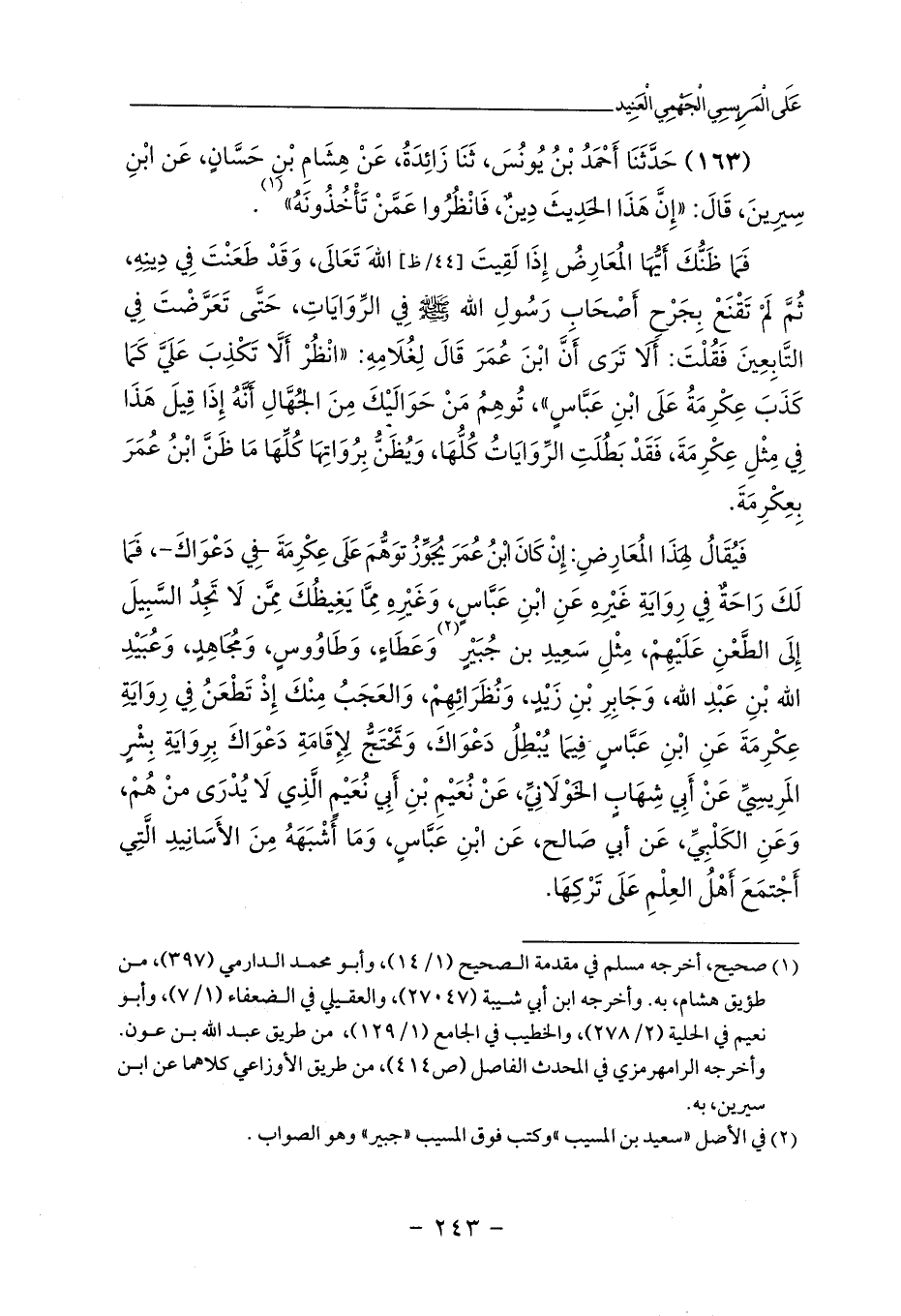 فَيُقَالُ لِهَذَا المُعَارِضِ: إِنْ كَانَ ابْنُ عُمَرَ يُجَوِّزُ توَهُّمَ عَلَى عِكْرِمَةَ -فِي دَعْوَاكَ-، فَمَا لَكَ رَاحَةٌ فِي رِوَايَةِ غَيْرِهِ عَنِ ابْنِ عَبَّاسٍ، وَغَيْرِهِ مِمَّا يَغِيظُكَ مِمَّن لَا تَجِدُ السَّبِيلَ إِلَى الطَّعْنِ عَلَيْهِمْ، مِثْلِ سَعِيدِ بن جُبَيْرٍ (¬2) وَعَطَاءٍ، وَطَاوُوسٍ، وَمُجَاهِدٍ، وَعُبَيْدِ الله بْنِ عَبْدِ الله، وَجَابِرِ بْنِ زَيْدٍ، وَنُظَرَائِهِمْ، وَالعَجَبُ مِنْكَ إِذْ تَطْعَنُ فِي رِوَايَةِ عِكْرِمَةَ عَنِ ابْنِ عَبَّاسٍ فِيمَا يُبْطِلُ دَعْوَاكَ، وَتَحْتَجُّ لِإِقَامَةِ دَعْوَاكَ بِرِوَايَةِ بِشْرٍ المَرِيسِيِّ عَنْ أَبِي شِهَابٍ الخَوْلَانِيِّ، عَنْ نُعَيْمِ بْنِ أَبِي نُعَيْمٍ الَّذِي لَا يُدْرَى منْ هُمْ، وَعَنِ الكَلْبِيِّ، عَن أبي صَالح، عَن ابْنِ عَبَّاسٍ، وَمَا أَشْبَهَهُ مِنَ الأَسَانِيدِ الَّتِي أَجْتمَعَ أَهْلُ العِلْمِ عَلَى تَرْكِهَا.