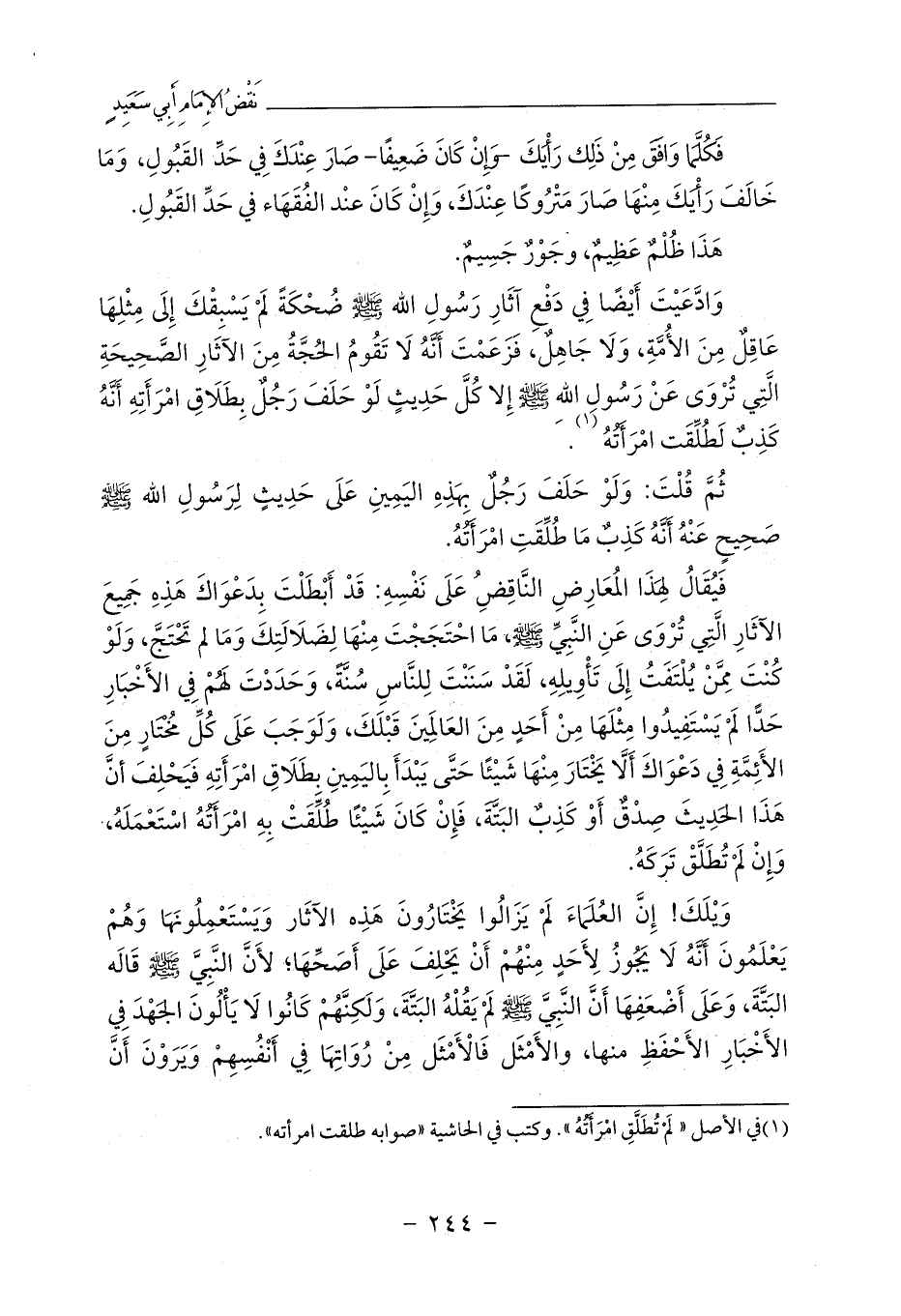 وَادَّعَيْتَ أَيْضًا فِي دَفْعِ آثَارِ رَسُولِ الله - صلى الله عليه وسلم - ضُحْكَةً لَمْ يَسْبِقْكَ إِلَى مِثْلِهَا عَاقِلٌ مِنَ الأُمَّةِ، وَلَا جَاهِلٌ، فَزَعَمْتَ أَنَّهُ لَا تَقُومُ الحُجَّةُ مِنَ الآثَارِ الصَّحِيحَةِ الَّتِي تُرْوَى عَنْ رَسُولِ اللهِ - صلى الله عليه وسلم - إِلا كُلَّ حَدِيثٍ لَوْ حَلَفَ رَجُلٌ بِطَلَاقِ امْرَأَتِهِ أَنَّهُ كَذِبٌ لَطُلِّقَت امْرَأَتُهُ (¬1).