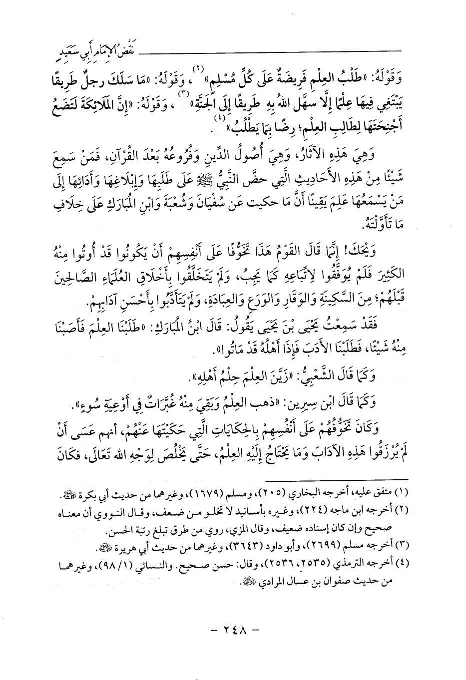 وَقَوْلَهُ: «طَلْبُ العِلْمِ فَرِيضَةٌ عَلَى كُلِّ مُسْلِمٍ» (¬1)، وَقَوْلَهُ: «مَا سَلَكَ رجلٌ طَرِيقًا يَبْتَغِي فِيهَا عِلْمًا إِلَّا سهَّل اللهُ بِهِ طَرِيقًا إِلَى الجَنَّةِ» (¬2)، وَقَوْلَهُ: «إِنَّ المَلَائِكَةَ لَتَضَعُ أَجْنِحَتَهَا لِطَالِبِ العِلْمِ؛ رِضًا بِمَا يَطْلُبُ» (¬3).