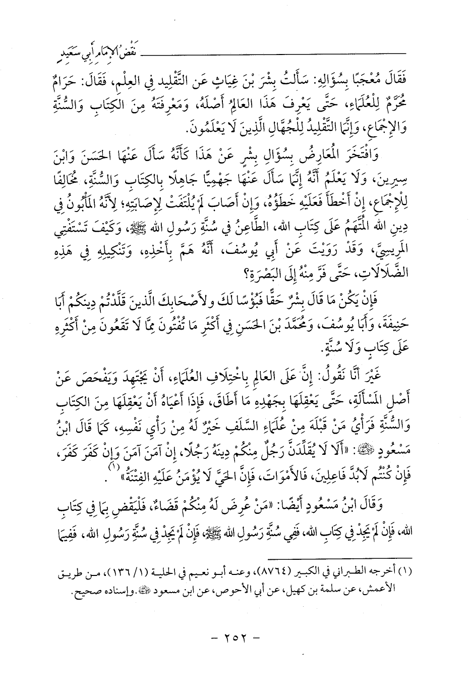 وَافْتَخَرَ المُعَارِضُ بِسُؤَالِ بِشْرٍ عَنْ هَذَا كَأَنَّهُ سَأَلَ عَنْهَا الحَسَنَ وَابْنَ سِيرِينَ، وَلَا يَعْلَمُ أَنَّهُ إِنَّمَا سَأَلَ عَنْهَا جَهْمِيًّا جَاهِلًا بِالكِتَابِ وَالسُّنَّةِ، مُخَالِفًا لِلْإِجْمَاعِ، إِنْ أَخْطَأَ فَعَلَيْهِ خَطَؤُهُ، وَإِنْ أَصَابَ لَمْ يُلْتَفَتْ لِإِصَابَتِهِ؛ لِأَنَّهُ المَأْبُونُ فِي دِينِ الله المُتَّهَمُ عَلَى كِتَابِ الله، الطَّاعِنُ في سُنَّةِ رَسُولِ الله - صلى الله عليه وسلم -، وَكَيْفَ تَسْتَفْتِي المَرِيسِيَّ، وَقَدْ رَوَيْتَ عَنْ أَبِي يُوسُفَ، أَنَّهُ هَمَّ بِأَخْذِهِ، وَتَنْكِيلِهِ فِي هَذِهِ الضَّلَالَاتِ، حَتَّى فَرَّ مِنْهُ إِلَى البَصْرَةِ؟