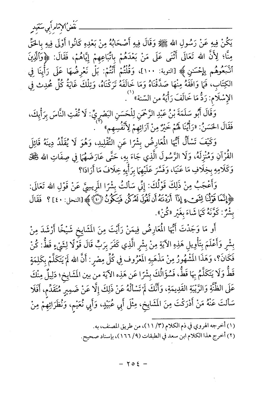 وَكَيْفَ تَسْأَلُ أَيُّهَا المُعَارِضُ بِشْرًا عَنِ التَّقْلِيدِ، وَهُوَ لَا يُقَلِّدُ دِينَهُ قَائِلَ القُرْآنِ وَمُنْزِلَهُ، وَلَا الرَّسُولَ الَّذِي جَاءَ بِهِ، حَتَّى عَارَضَهُمَا فِي صِفَاتِ الله - عز وجل - وَكَلَامِهِ بِخِلَافِ مَا عَنَيَا، وَفَسَّرَ عَلَيْهِمَا بِرَأْيِهِ خِلَافَ مَا أَرَادَا؟