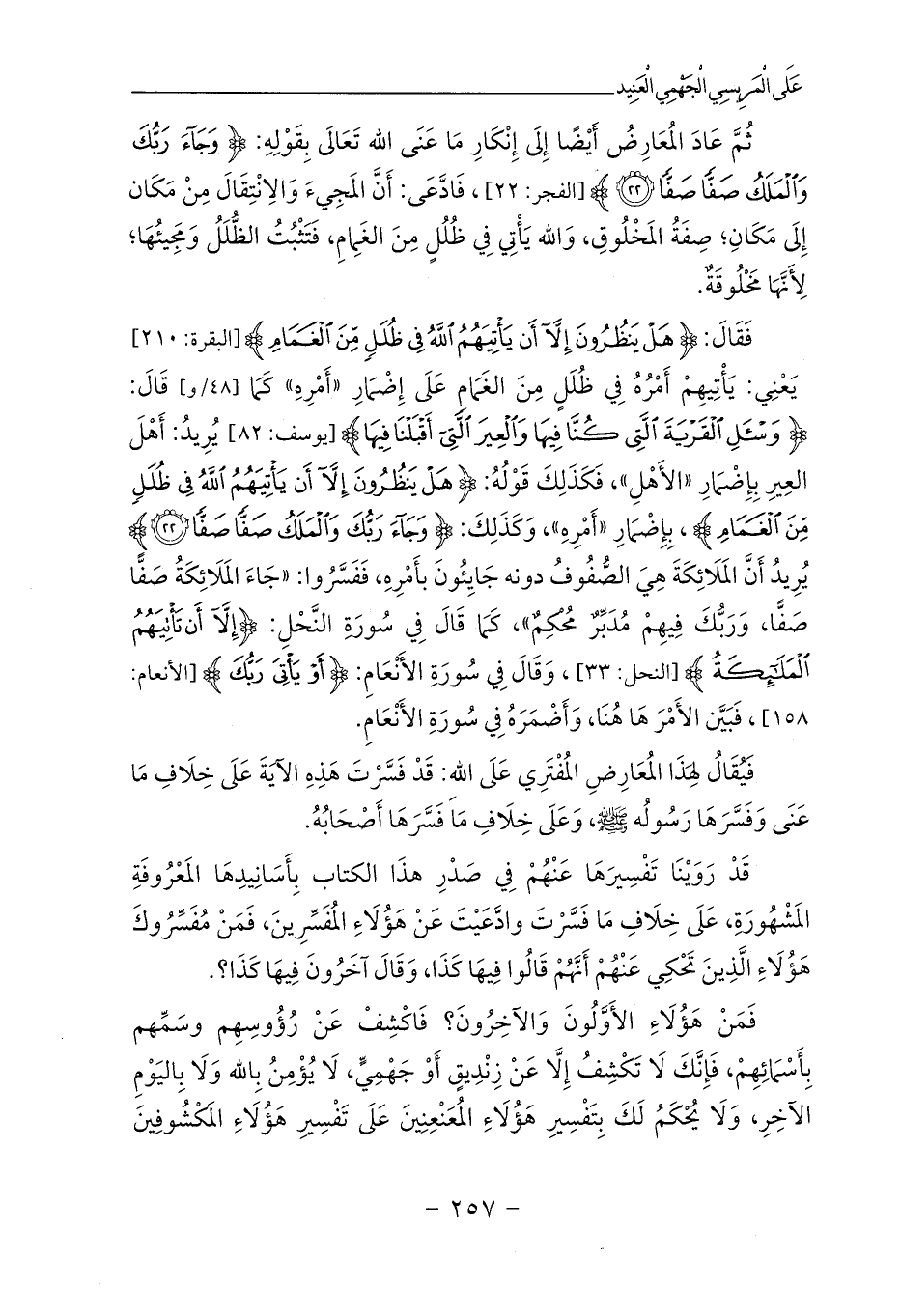 ثُمَّ عَادَ المُعَارِضُ أَيْضًا إِلَى إِنْكَارِ مَا عَنَى الله تَعَالَى بِقَوْلِهِ: {وَجَاءَ رَبُّكَ وَالْمَلَكُ صَفًّا صَفًّا (22)} [الفجر: 22]، فَادَّعَى: أَنَّ المَجِيءَ وَالِانْتِقَالَ مِنْ مَكَان إِلَى مَكَانِ؛ صِفَةُ المَخْلُوقِ، وَالله يَأْتِي فِي ظُلُلٍ مِنَ الغَمِامِ، فَتَثْبُتُ الظُّلَلُ وَمَجِيئُهَا؛ لِأَنَّهَا مَخْلُوقَةٌ.