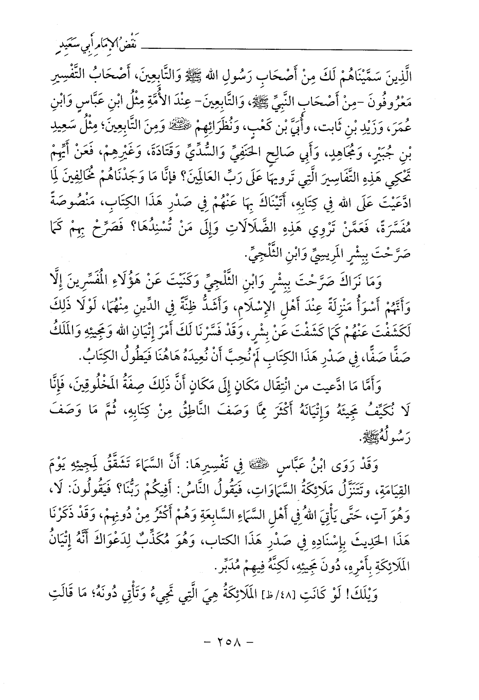 وَمَا نَرَاكَ صَرَّحْتَ بِبِشْرٍ وَابْنِ الثَّلْجِيِّ وَكَنَيْتَ عَنْ هَؤُلَاءِ المُفَسِّرِينَ إِلَّا وَأَنَّهُمْ أَسْوَأُ مَنْزِلَةً عِنْدَ أَهْلِ الإِسْلَامِ، وَأَشَدُّ ظِنَّةً فِي الدِّينِ مِنْهُمَا، لَوْلَا ذَلِكَ لَكَشَفْتَ عَنْهُمْ كَمَا كَشَفْتَ عَنْ بِشْرٍ، وَقَدْ فَسَّرْنَا لَكَ أَمْرَ إِتْيَانِ الله وَمَجِيئِهِ وَالمَلَكُ صَفًّا صَفًّا، فِي صَدْرِ هَذَا الكِتَابِ لَمْ نُحِبَّ أَنْ نُعِيدَهُ هَاهُنَا فَيَطُولُ الكِتَابُ.