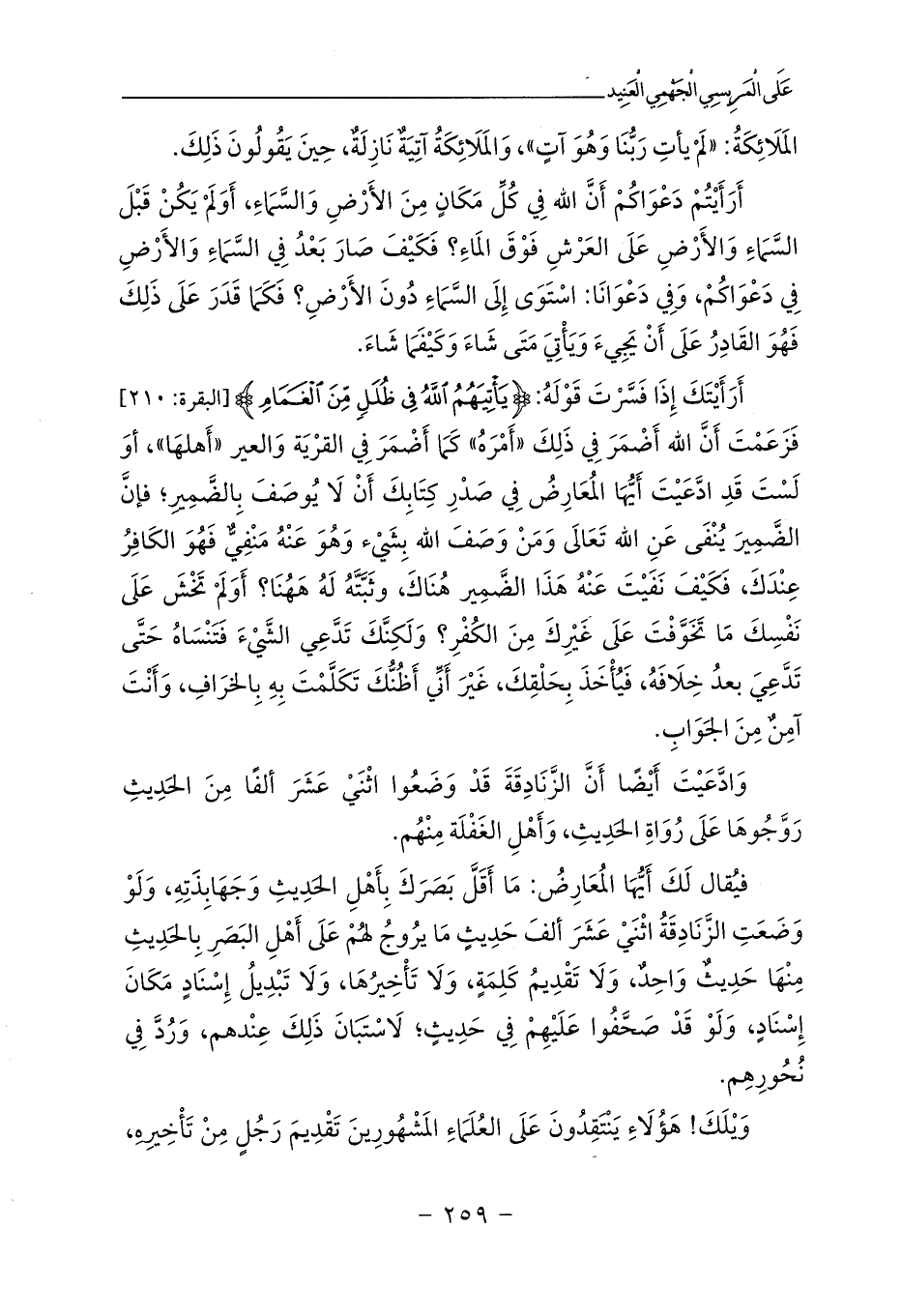 أَرَأَيْتُمْ دَعْوَاكُمْ أَنَّ الله فِي كُلِّ مَكَانٍ مِنَ الأَرْضِ وَالسَّمَاءِ، أَوَلَمْ يَكُنْ قَبْلَ السَّمَاءِ وَالأَرْضِ عَلَى العَرْشِ فَوْقَ المَاءِ؟ فَكَيْفَ صَارَ بَعْدُ فِي السَّمَاءِ وَالأَرْضِ ... فِي دَعْوَاكُمْ، وَفِي دَعْوَانَا: اسْتَوَى إِلَى السَّمَاءِ دُونَ الأَرْضِ؟ فَكَمَا قَدَرَ عَلَى ذَلِكَ فَهُوَ القَادِرُ عَلَى أَنْ يَجِيءَ وَيَأْتِيَ مَتَى شَاءَ وَكَيْفَمَا شَاءَ.