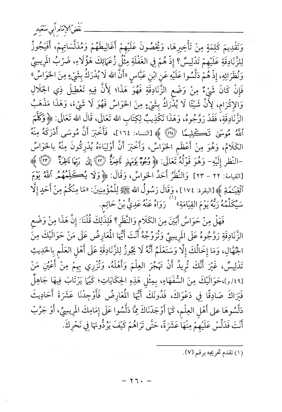 وَتَقْدِيمَ كَلِمَةٍ مِنْ تَأْخِيرِهَا، وَيُحْصُونَ عَلَيْهِمْ أَغَالِيطَهُمْ وَمُدَلَّسَاتِهِمْ، أَفَيَجُوزُ لِلزَّنَادِقَةِ عَلَيْهِمْ تَدْلِيسٌ؟ إِذْ هُمْ فِي الغَفْلَةِ مِثْلُ زُعَمَائِكَ هَؤُلَاءِ، ضَرْبُ المَرِيسِيِّ وَنُظَرَائِهِ، إِذْ هُمْ دَلَّسُوا عَلَيْهِ عَنِ ابْنِ عَبَّاسٍ «أَنَّ الله لَا يُدْرَكُ بِشَيْءٍ مِنَ الحَوَاسِّ» فَإِنْ كَانَ شَيْءٌ مِنْ وَضْعِ الزَّنَادِقَةِ فَهُوَ هَذَا؛ لِأَنَّ فِيهِ تَعْطِيلَ ذِي الجَلَالِ وَالإِكْرَامِ، لِأَنَّ شَيْئًا لَا يُدْرَكُ بِشَيْءٍ مِنَ الحَوَاسِّ فَهُوَ لَا شَيْءَ، وَهَذَا مَذْهَبُ الزَّنَادِقَةِ، فَقَدْ رَوَّجُوهُ، وَهَذَا تَكْذِيبٌ لِكِتَابِ الله تَعَالَى، قَالَ الله تَعَالَى: {وَكَلَّمَ اللَّهُ مُوسَى تَكْلِيمًا (164)} [النساء: 164]، فَأَخْبَرَ أَنَّ مُوسَى أَدْرَكَهُ مِنْهُ الكَلَامُ، وَهُوَ مِنْ أَعْظَمِ الحَوَاسِّ، وَأَخْبَرَ أَنَّ أَوْلِيَاءَهُ يُدْرِكُونَ مِنْهُ بالحَوَاسِّ ... -النّظر إِلَيْهِ- وَهُوَ قَوْلُهُ تَعَالَى: {وُجُوهٌ يَوْمَئِذٍ نَاضِرَةٌ (22) إِلَى رَبِّهَا نَاظِرَةٌ (23)} [القيامة: 22 - 23] وَالنَّظَرُ أَحَدُ الحَواسِّ، وَقَالَ: {وَلَا يُكَلِّمُهُمُ اللَّهُ يَوْمَ الْقِيَامَةِ} [البقرة: 174]، وَقَالَ رَسُولُ الله - صلى الله عليه وسلم - لِلْمُؤْمِنِينَ: «مَا مِنْكُمْ مِنْ أَحَدٍ إِلَّا سَيُكَلِّمُهُ رَبُّهُ يَوْمَ القِيَامَةِ» (¬1) رَوَاهُ عَنْهُ عَدِيُّ بْنُ حَاتِمٍ.