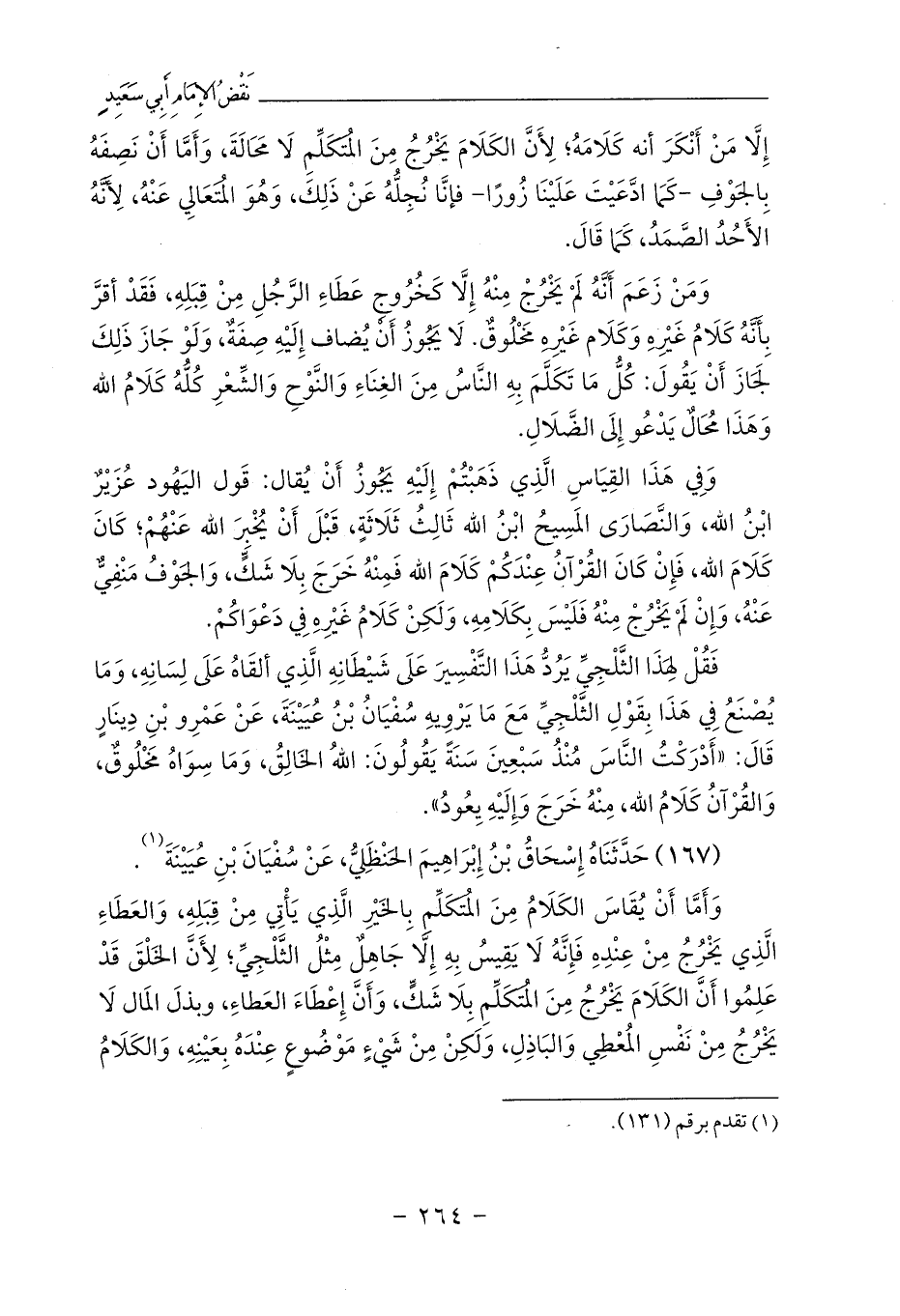 إِلَّا مَنْ أَنْكَرَ أنه كَلَامَهُ؛ لِأَنَّ الكَلَامَ يَخْرُجُ مِنَ المُتَكَلِّمِ لَا مَحَالَةَ، وَأَمَّا أَنْ نَصِفَهُ بِالجَوْفِ -كَمَا ادَّعَيْتَ عَلَيْنَا زُورًا- فإنَّا نُجِلُّهُ عَنْ ذَلِكَ، وَهُوَ المُتَعَالِي عَنْهُ، لِأَنَّهُ الأَحُدُ الصَّمَدُ، كَمَا قَالَ.