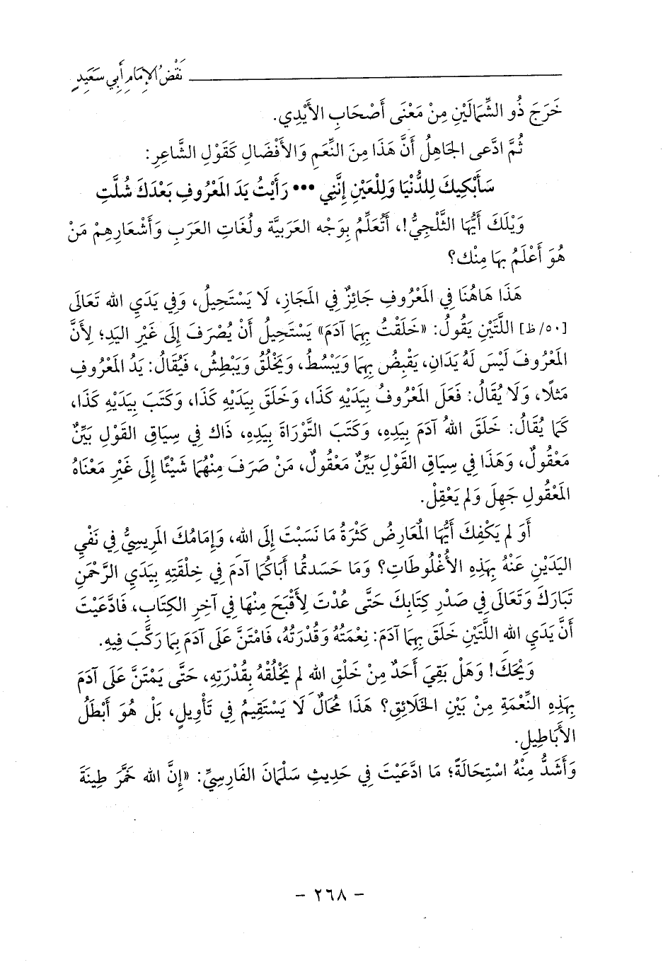 أَوَ لم يَكْفِكَ أَيُّهَا المُعَارِضُ كَثْرَةُ مَا نَسَبْتَ إِلَى اللهِ، وَإِمَامُكَ المَرِيسِيُّ فِي نَفْيِ اليَدَيْنِ عَنْهُ بِهَذِهِ الأُغْلُوطَاتِ؟ وَمَا حَسَدتُما أَبَاكُمَا آدمَ فِي خِلْقَتِهِ بِيَدَيِ الرَّحْمَنِ تَبَارَكَ وَتَعَالَى فِي صَدْرِ كِتَابِكَ حَتَّى عُدْتَ لِأَقْبَحَ مِنْهَا فِي آخِرِ الكِتَابِ، فَادَّعَيْتَ أَنَّ يَدَيِ اللهِ اللَّتَيْنِ خَلَقَ بِهِمَا آدَمَ: نِعْمَتُهُ وَقُدْرَتُهُ، فَامْتَنَّ عَلَى آدَمَ بِمَا رَكَّبَ فِيهِ.