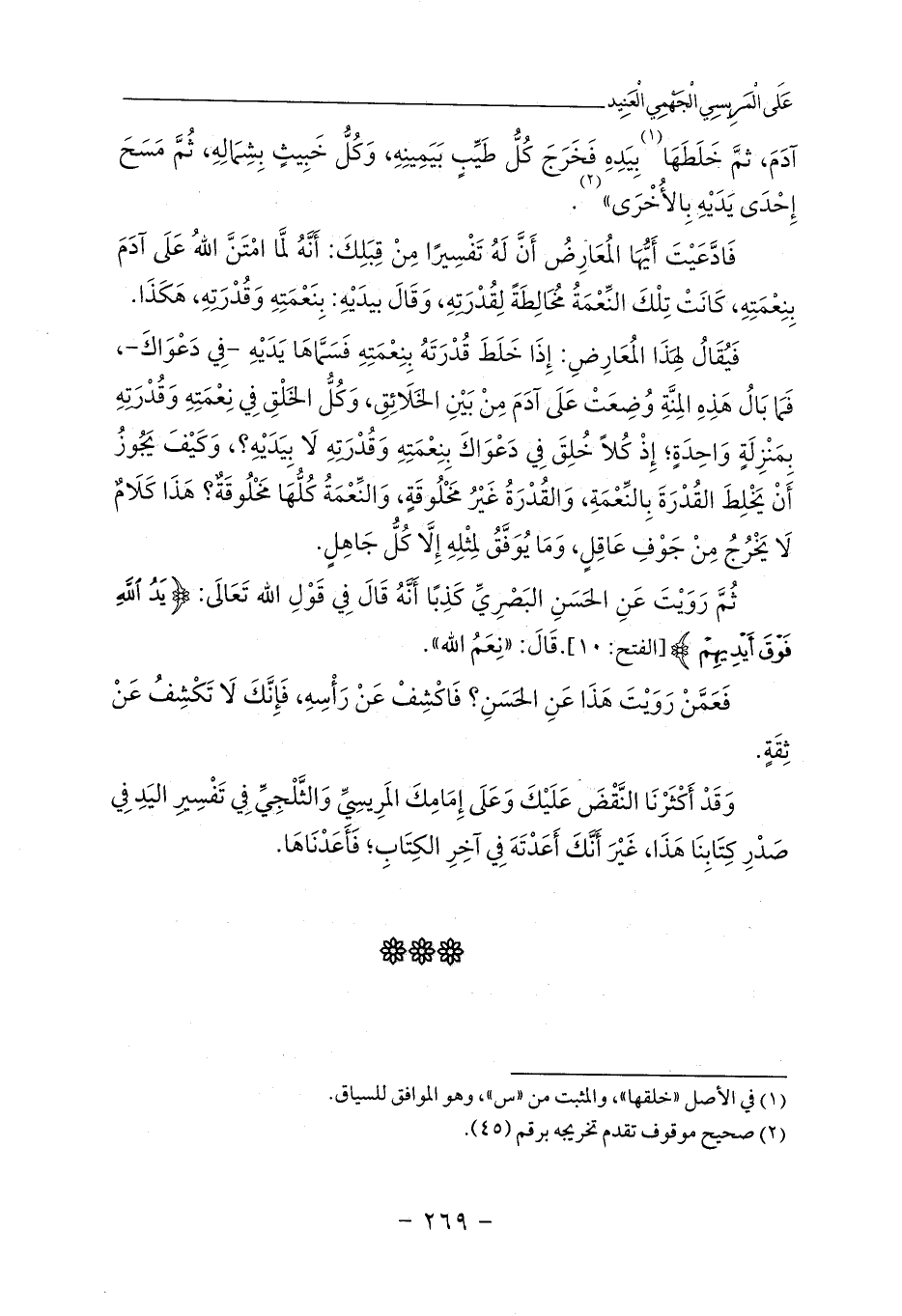 وَقَدْ أَكْثَرْنَا النَّقْضَ عَلَيْكَ وَعَلَى إِمَامِكَ المَرِيسِيِّ وَالثَّلْجِيِّ فِي تَفْسِيرِ اليَدِ فِي صَدْرِ كِتَابِنَا هَذَا، غَيْرَ أَنَّكَ أَعَدْتَهَ فِي آخِرِ الكِتَابِ؛ فَأَعَدْنَاهَا.