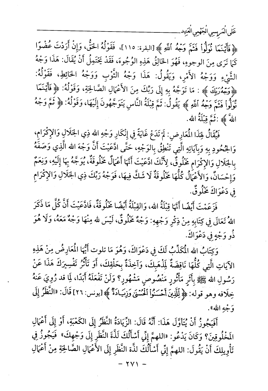 فَيُقَالُ لِهَذَا المُعَارِضِ: لَمْ تَدَعْ غَايَةً فِي إِنْكَارِ وَجْهِ الله ذِي الجَلَالِ وَالإِكْرَامِ، وَالجُحُودِ بِهِ وَبِآيَاتِهِ الَّتِي تَنْطِقُ بِالوَجْهِ، حَتَّى ادَّعَيْتَ أَنَّ وَجْهَ الله الَّذِي وَصَفَهُ بِالجَلَالِ وَالإِكْرَامِ مَخْلُوقٌ، لِأَنَّكَ ادَّعَيْتَ أَنَّهَا أَعْمَالٌ مَخْلُوقَةٌ، يُوَجَّهُ بِهَا إِلَيْهِ، وَنِعَمٌ وَإِحْسَانٌ، وَالأَعْمَالُ كُلُّهَا مَخْلُوقَةٌ لَا شَكَّ فِيهَا، فَوَجْهُ رَبِّكَ ذِي الجَلَالِ وَالإِكْرَامِ فِي دَعْوَاكَ مَخْلُوقٌ.