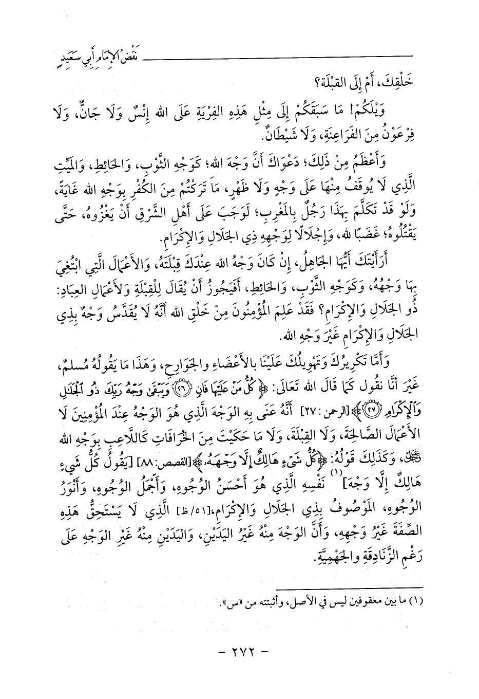 أَرَأَيْتَكَ أَيُّهَا الجَاهِلُ، إِنْ كَانَ وَجْهُ الله عِنْدَكَ قِبْلَتَهُ، وَالأَعْمَالَ الَّتِي ابْتُغِيَ بِهَا وَجْهُهُ، وَكَوَجْهِ الثَّوْبِ، وَالحَائِطِ، أَفَيَجُوزُ أَنْ يُقَالَ لِلْقِبْلَةِ وَلأَعْمَالِ العِبَادِ: ذُو الجَلَالِ وَالإِكْرَامِ؟ فَقَدْ عَلِمَ المُؤْمِنُونَ مِنْ خَلْقِ الله أَنَّهُ لَا يُقَدَّسُ وَجْهٌ بِذِي الجَلَالِ وَالإِكْرَامِ غَيْرَ وَجْهِ الله.