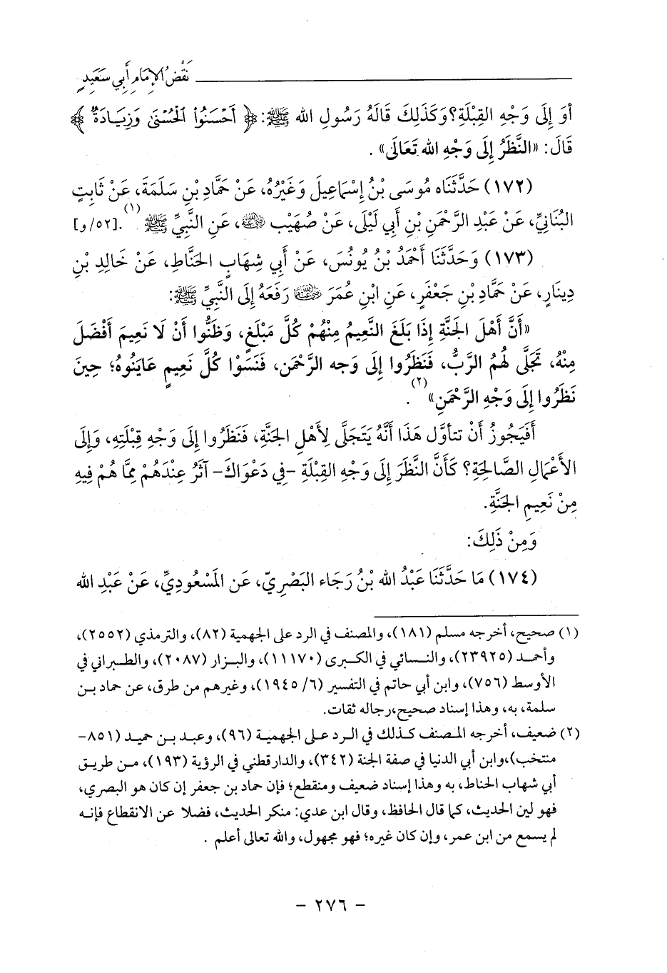(¬2) ضعيف، أخرجه المصنف كذلك في الرد على الجهمية (96)، وعبد بن حميد (851 - منتخب)،وابن أبي الدنيا في صفة الجنة (342)، والدارقطني في الرؤية (193)، من طريق أبي شهاب الحناط، به وهذا إسناد ضعيف ومنقطع؛ فإن حماد بن جعفر إن كان هو البصري، فهو لين الحديث، كما قال الحافظ، وقال ابن عدي: منكر الحديث، فضلا عن الانقطاع فإنه لم يسمع من ابن عمر، وإن كان غيره؛ فهو مجهول، والله تعالى أعلم.