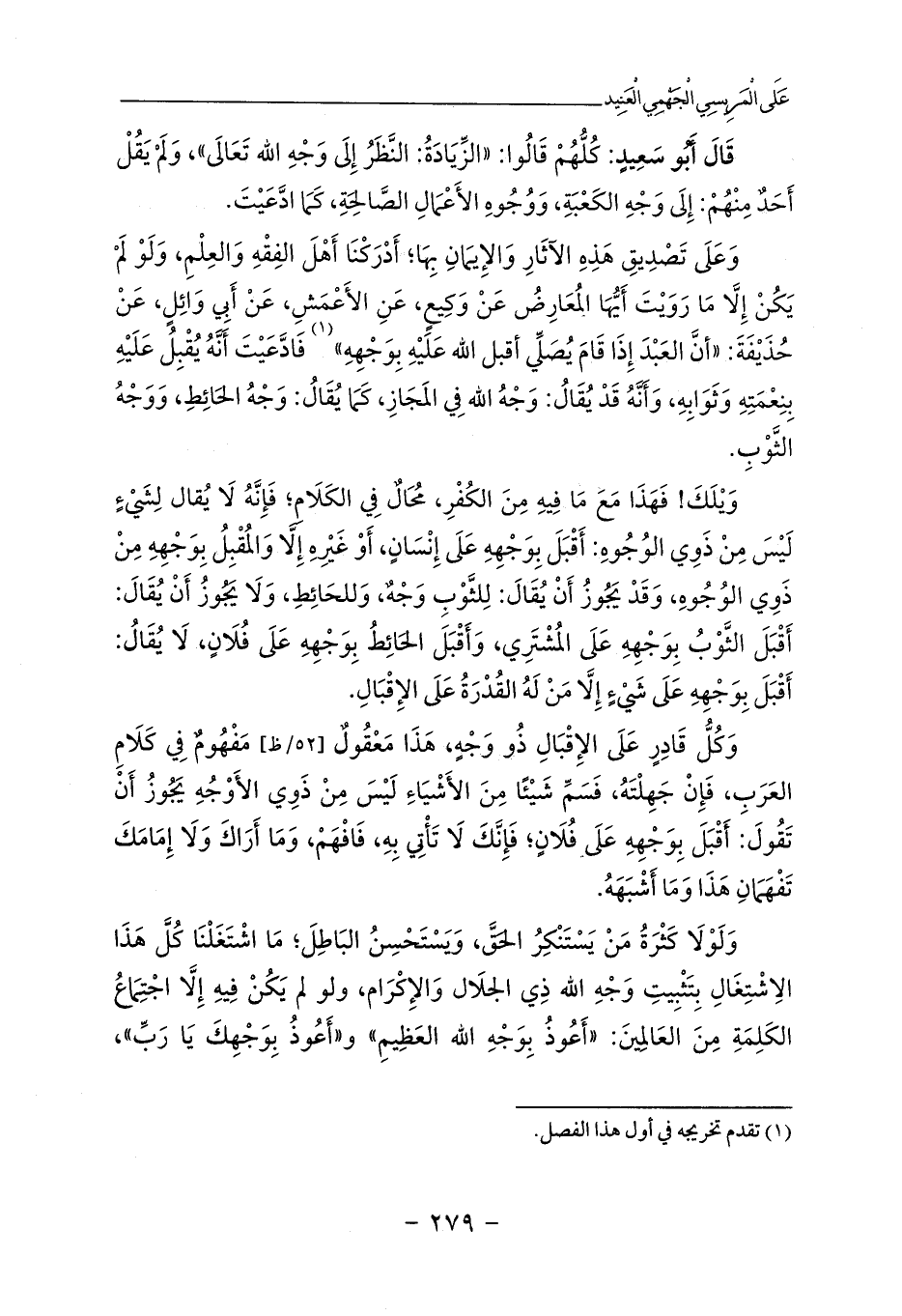 وَكُلُّ قَادِرٍ عَلَى الإِقْبَالِ ذُو وَجْهٍ، هَذَا مَعْقُولٌ [52/ظ] مَفْهُومٌ فِي كَلَامِ العَرَبِ، فَإِنْ جَهِلْتَهُ، فَسَمِّ شَيْئًا مِنَ الأَشْيَاءِ لَيْسَ مِنْ ذَوِي الأَوْجُهِ يَجُوزُ أَنْ تَقُولَ: أَقْبَلَ بِوَجْهِهِ عَلَى فُلَانٍ؛ فَإِنَّكَ لَا تَأْتِي بِهِ، فَافْهَمْ، وَمَا أَرَاكَ وَلَا إِمَامَكَ تَفْهَمَانِ هَذَا وَمَا أَشْبَهَهُ.
