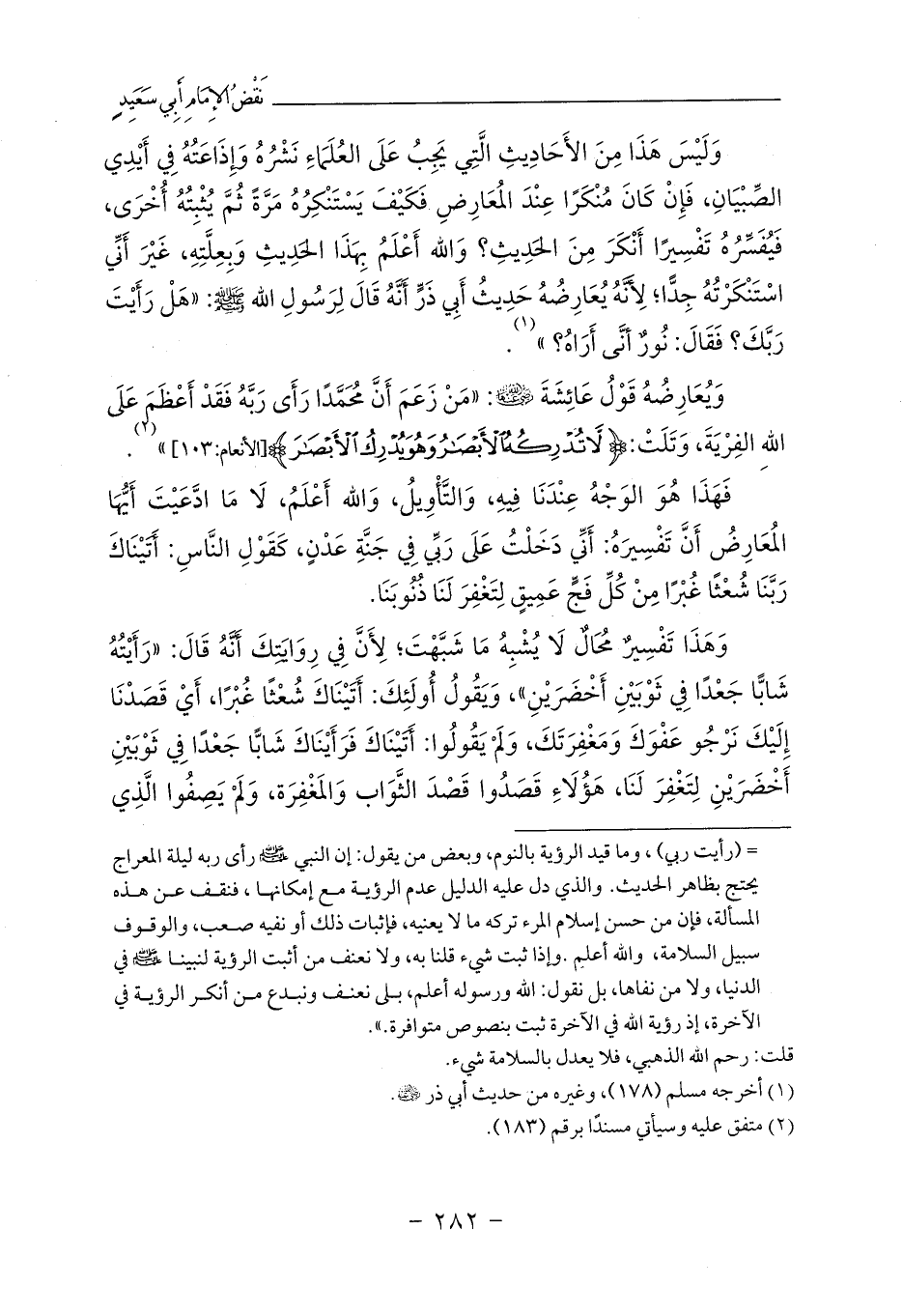وَلَيْسَ هَذَا مِنَ الأَحَادِيثِ الَّتِي يَجِبُ عَلَى العُلَمَاءِ نَشْرُهُ وَإِذَاعَتُهُ فِي أَيْدِي الصِّبْيَانِ، فَإِنْ كَانَ مُنْكَرًا عِنْدَ المُعَارِضِ فَكَيْفَ يَسْتَنْكِرُهُ مَرَّةً ثُمَّ يُثْبِتُهُ أُخْرَى، فَيُفَسِّرُهُ تَفْسِيرًا أَنْكَرَ مِنَ الحَدِيثِ؟ وَالله أَعْلَمُ بِهَذَا الحَدِيثِ وَبِعِلَّتِهِ، غَيْرَ أَنِّي اسْتَنْكَرْتُهُ جِدًّا؛ لِأَنَّهُ يُعَارِضُهُ حَدِيثُ أَبِي ذَرٍّ أَنَّهُ قَالَ لِرَسُولِ الله - صلى الله عليه وسلم -: «هَلْ رَأَيْتَ رَبَّكَ؟ فَقَالَ: نُورٌ أنَّى أَرَاهُ؟» (¬1).