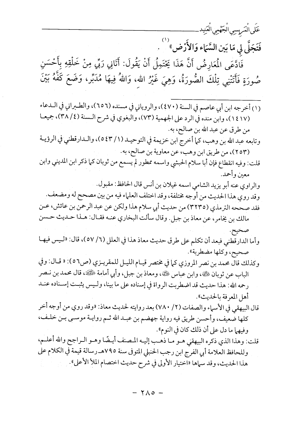 قال البيهقي في الأسماء والصفات (2/ 780) بعد روايته لحديث معاذ: «وقد روي من أوجه أخر كلها ضعيف، وأحسن طريق فيه رواية جهضم بن عبد الله ثم رواية موسى بن خلف، وفيهما ما دل على أن ذلك كان في النوم».
