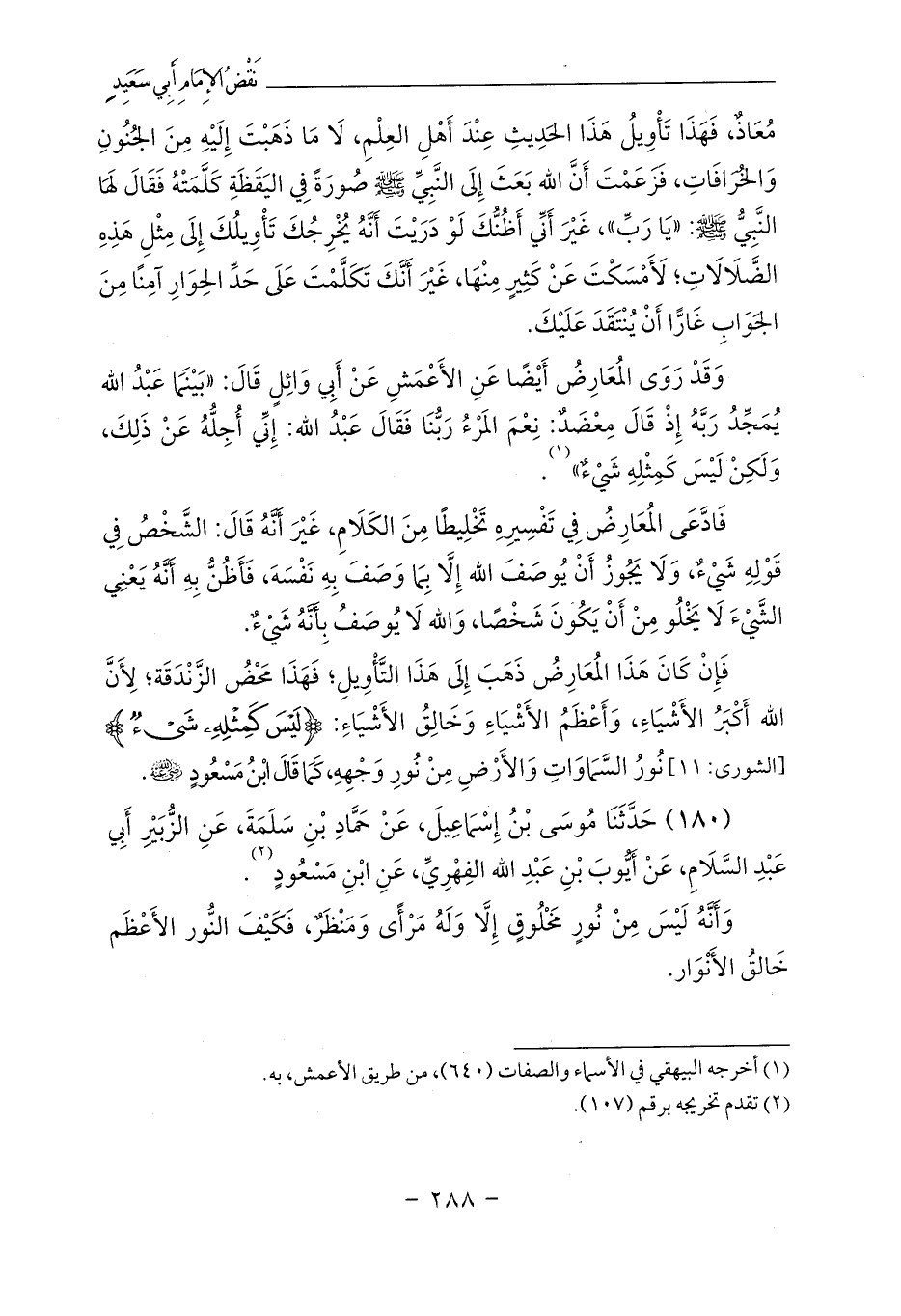 فَإِنْ كَانَ هَذَا المُعَارِضُ ذَهَبَ إِلَى هَذَا التَّأْوِيلِ؛ فَهَذَا مَحْضُ الزَّنْدَقَة؛ لِأَنَّ الله أَكْبَرُ الأَشْيَاءِ، وَأَعْظَمُ الأَشْيَاءِ وَخَالِقُ الأَشْيَاءِ: {لَيْسَ كَمِثْلِهِ شَيْءٌ} [الشورى: 11] نُورُ السَّمَاوَاتِ وَالأَرْضِ مِنْ نُورِ وَجْهِهِ، كَمَا قَالَ ابْنُ مَسْعُودٍ - رضي الله عنه -.