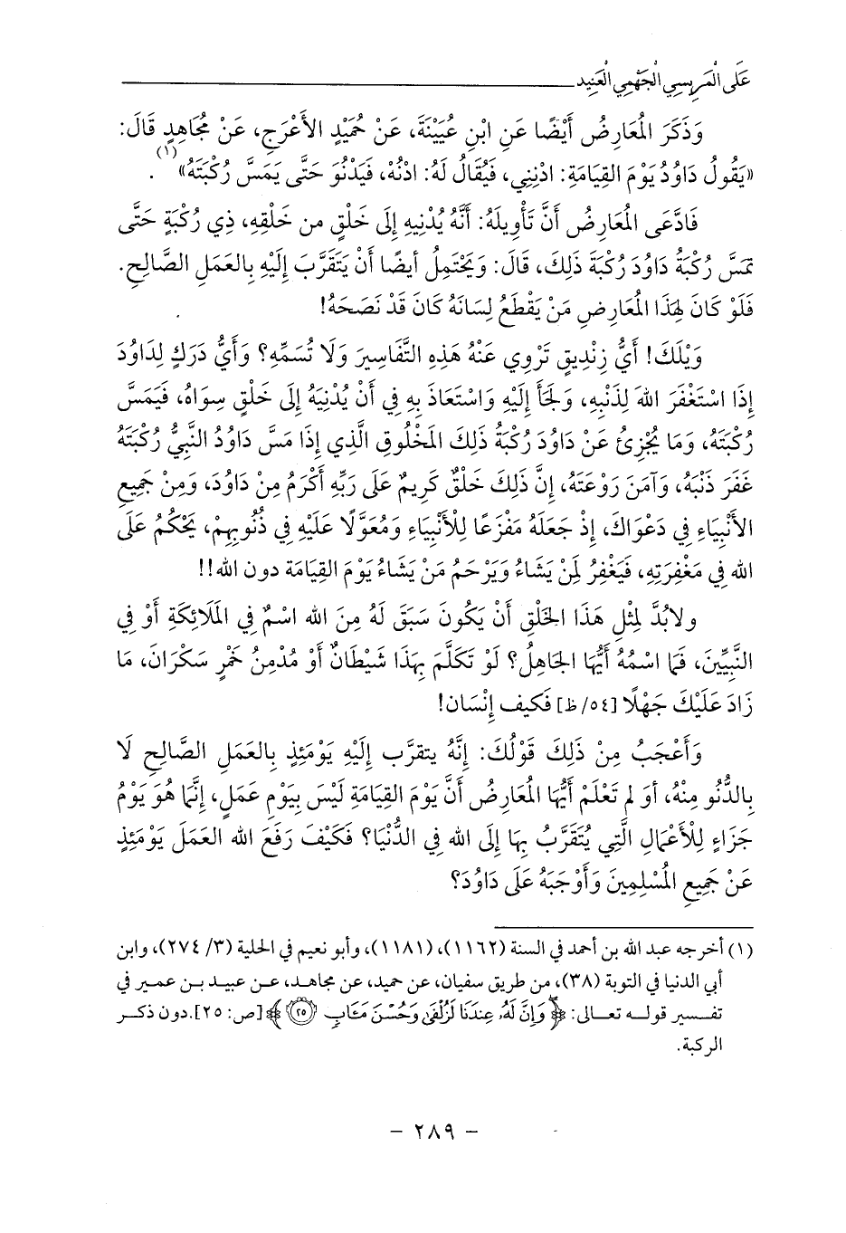 وَيْلَكَ! أَيُّ زِنْدِيقٍ تَرْوِي عَنْهُ هَذِهِ التَّفَاسِيرَ وَلَا تُسَمِّهِ؟ وَأَيُّ دَرَكٍ لِدَاوُدَ إِذَا اسْتَغْفَرَ اللهَ لِذَنْبِهِ، وَلَجَأَ إِلَيْهِ وَاسْتَعَاذَ بِهِ فِي أَنْ يُدْنِيَهُ إِلَى خَلْقٍ سِوَاهُ، فَيَمَسَّ رُكْبَتَهُ، وَمَا يُجْزِئُ عَنْ دَاوُدَ رُكْبَةُ ذَلِكَ المَخْلُوقِ الَّذِي إِذَا مَسَّ دَاوُدُ النَّبِيُّ رُكْبَتَهُ غَفَرَ ذَنْبَهُ، وَآمَنَ رَوْعَتَهُ، إِنَّ ذَلِكَ خَلْقٌ كَرِيمٌ عَلَى رَبِّهِ أَكْرَمُ مِنْ دَاوُدَ، وَمِنْ جَمِيعِ الأَنْبِيَاءِ فِي دَعْوَاكَ، إِذْ جَعَلَهُ مَفْزَعًا لِلْأَنْبِيَاءِ وَمُعَوَّلًا عَلَيْهِ فِي ذُنُوبِهِمْ، يَحْكُمُ عَلَى الله فِي مَغْفِرَتِهِ، فَيَغْفِرُ لِمَنْ يَشَاءُ وَيَرْحَمُ مَنْ يَشَاءُ يَوْمَ القِيَامَة دون الله!!