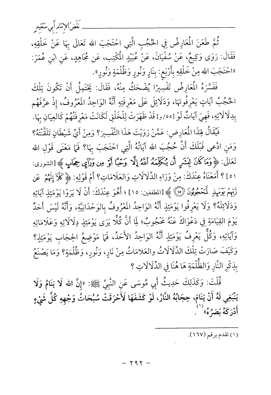ثُمَّ طَعَنَ المُعَارِضُ فِي الحُجُبِ الَّتِي احْتَجَبَ الله تَعَالَى بِهَا عَنْ خَلْقِهِ، فَقَالَ: رَوَى وَكِيعٌ، عَنْ سُفْيَانَ، عَنْ عُبَيْدٍ المُكْتِب، عَن مُجَاهِدٍ، عَنِ ابْنِ عُمَرَ: «احْتَجَبَ الله مِنْ خَلْقِهِ بِأَرْبَعٍ: بِنَارٍ وَنُورٍ وَظُلْمَةٍ وَنُورٍ».