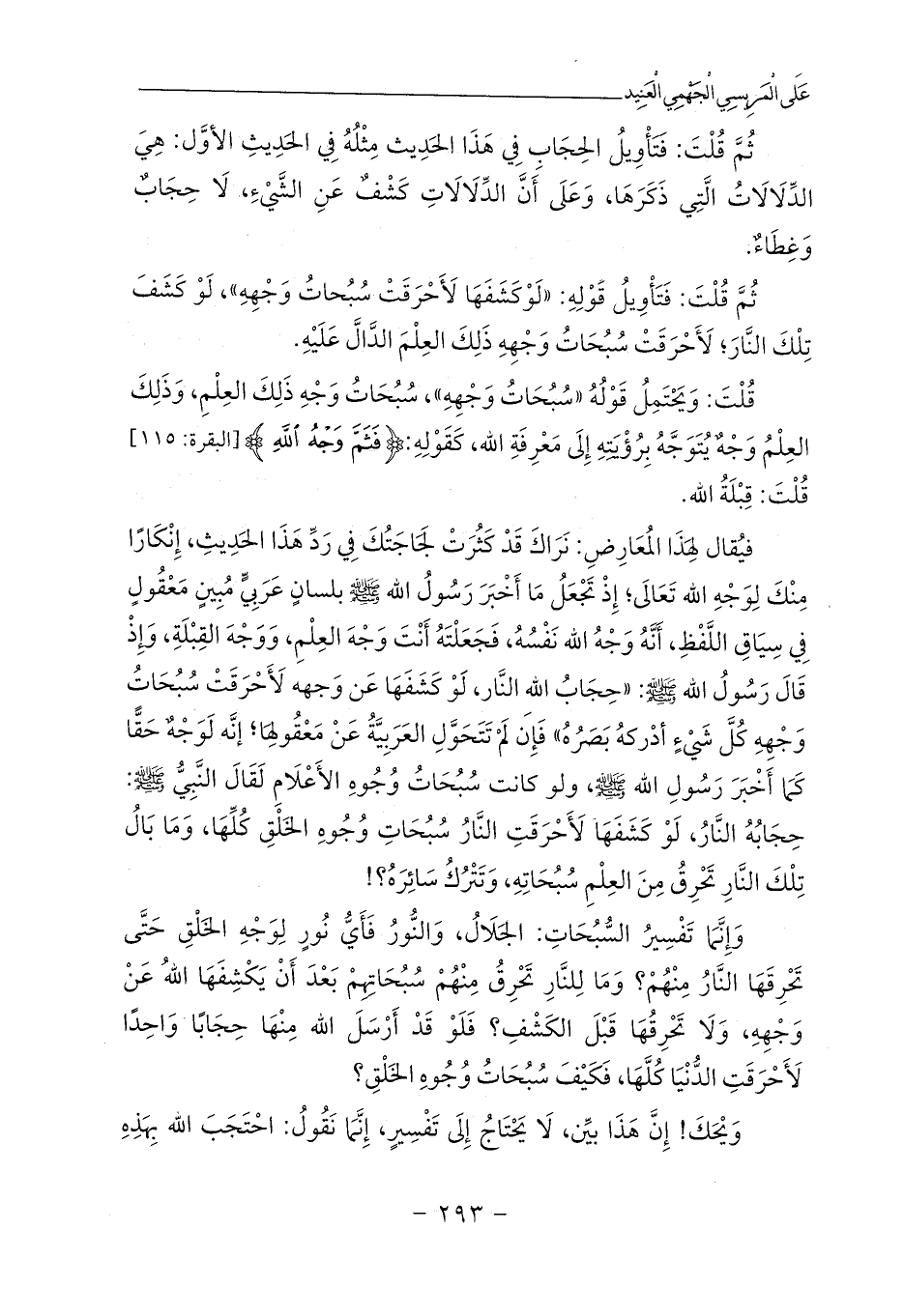 فيُقال لِهَذَا المُعَارِضِ: نَرَاكَ قَدْ كَثُرَتْ لَجَاجَتُكَ فِي رَدِّ هَذَا الحَدِيثِ، إِنْكَارًا مِنْكَ لِوَجْهِ الله تَعَالَى؛ إِذْ تَجْعَلُ مَا أَخْبَرَ رَسُولُ الله - صلى الله عليه وسلم - بلسانٍ عَرَبِيٍّ مُبِينٍ مَعْقُولٍ فِي سِيَاقِ اللَّفْظِ، أَنَّهُ وَجْهُ الله نَفْسُهُ، فَجَعَلْتَهُ أَنْتَ وَجْهَ العِلْمِ، وَوَجْهَ القِبْلَةِ، وَإِذْ قَالَ رَسُولُ الله - صلى الله عليه وسلم -: «حِجَابُ اللهِ النَّار، لَوْ كَشَفَهَا عَن وَجهه لَأَحْرَقَتْ سُبُحَاتُ وَجْهِهِ كُلَّ شَيْءٍ أدْركهُ بَصَرُهُ» فَإِن لَمْ تَتَحَوَّلِ العَرَبِيَّةُ عَنْ مَعْقُولِهَا؛ إنَّه لَوَجْهٌ حَقًّا كَمَا أَخْبَرَ رَسُولِ الله - صلى الله عليه وسلم -، ولو كانت سُبُحَاتُ وُجُوهِ الأَعْلَامِ لَقَالَ النَّبِيُّ - صلى الله عليه وسلم -: حِجَابُهُ النَّارُ، لَوْ كَشَفَهَا لَأَحْرَقَتِ النَّارُ سُبُحَاتِ وُجُوهِ الخَلْقِ كُلِّهَا، وَمَا بَالُ تِلْكَ النَّارِ تَحْرِقُ مِنَ العِلْمِ سُبُحَاتِهِ، وَتَتْرُكُ سَائِرَهُ؟!