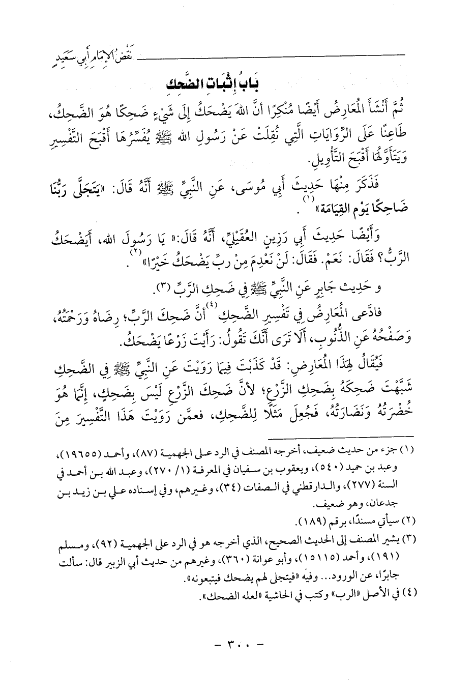 ثُمَّ أَنْشَأَ المُعَارِضُ أَيْضًا مُنْكِرًا أنَّ اللهَ يَضْحَكُ إِلَى شَيْءٍ ضَحِكًا هُوَ الضَّحِكُ، طَاعِنًا عَلَى الرِّوَايَاتِ الَّتِي نُقِلَتْ عَنْ رَسُولِ الله - صلى الله عليه وسلم - يُفَسِّرُهَا أَقْبَحَ التَّفْسِيرِ وَيَتَأَوَّلُهَا أَقْبَحَ التَّأْوِيلِ.