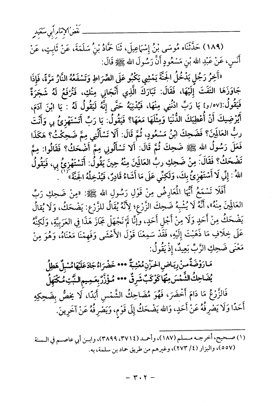 أَفَلَا تَسْمَعُ أَيُّهَا المُعَارِضُ مِنْ قَوْلِ رَسُولِ الله - صلى الله عليه وسلم -: «مِنْ ضَحِكِ رَبِّ العَالَمِينَ مِنْهُ»، أَنَّهُ لَا يُشْبِهُ ضَحِكَ الزَّرْعِ؛ لِأَنَّهُ يُقَالُ للزَّرْع: يَضْحَكُ، وَلَا يُقالُ يَضْحَكُ مِنْ أَحَدٍ وَلَا مِنْ أَجْلِ أَحَدٍ، وإنِّا لَمْ نَجْهَلْ مَجَازَ هَذَا فِي العَرَبِيَّةِ، وَلَكِنَّهُ عَلَى خِلَافِ مَا ذَهَبْتَ إِلَيْهِ، فَقَدْ سَمِعْنَا قَوْلَ الأَعْشَى وَفَهِمْنَا مَعْنَاهُ، وَهُوَ مِنْ مَعْنَى ضَحِكِ الرَّبِّ بَعِيدٌ، إِذْ يَقُولُ:
