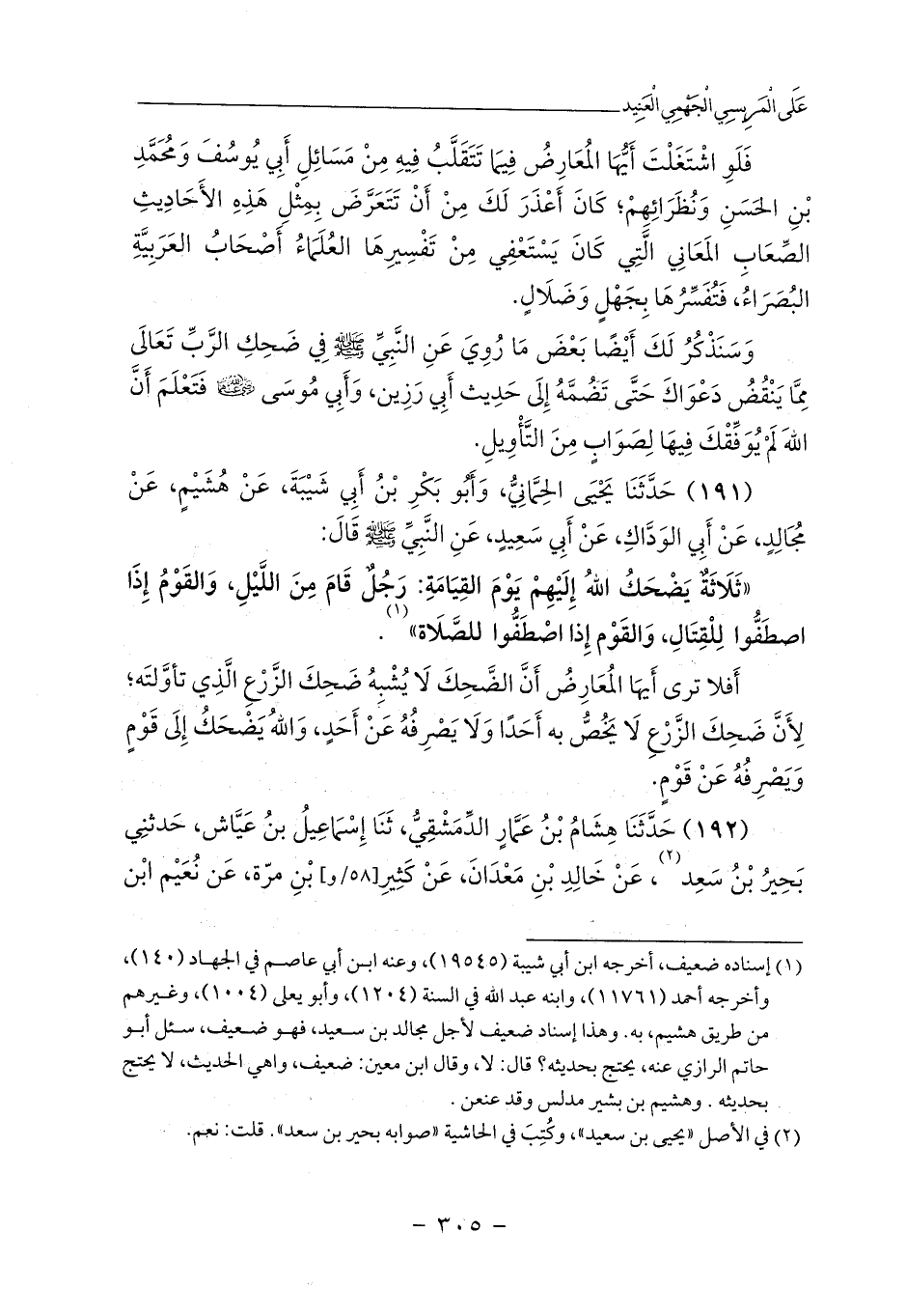 أَفلا ترى أَيهَا المُعَارِضُ أَنَّ الضَّحِكَ لَا يُشْبِهُ ضَحِكَ الزَّرْعِ الَّذِي تأوَّلتَه؛ لِأَنَّ ضَحِكَ الزَّرْعِ لَا يَخُصُّ به أَحَدًا وَلَا يَصْرِفُهُ عَنْ أَحَدٍ، وَاللهُ يَضْحَكُ إِلَى قَوْمٍ وَيَصْرِفُهُ عَنْ قَوْمٍ.