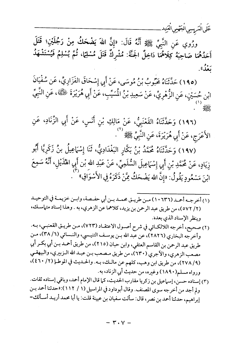 (197) وَحَدَّثَنَاهُ مُحَمَّدُ بْنُ بَكَّارٍ البَغْدَادِيُّ، ثَنَا إِسْمَاعِيلُ بنُ زَكَرِيَّا أَبُو زِيَادٍ، عَنْ مُحَمَّدِ بْنِ أَبِي إِسْمَاعِيلَ السُّلَمِيِّ، عَنْ عَبْدِ اللهِ بْن أَبِي الهُذَيْلِ، أَنَّهُ سَمِعَ ابْنَ مَسْعُودٍ يَقُولُ: «إِنَّ الله يَضْحَكُ مِمَّنْ ذَكَرَهُ فِي الأَسْوَاقِ» (¬3).