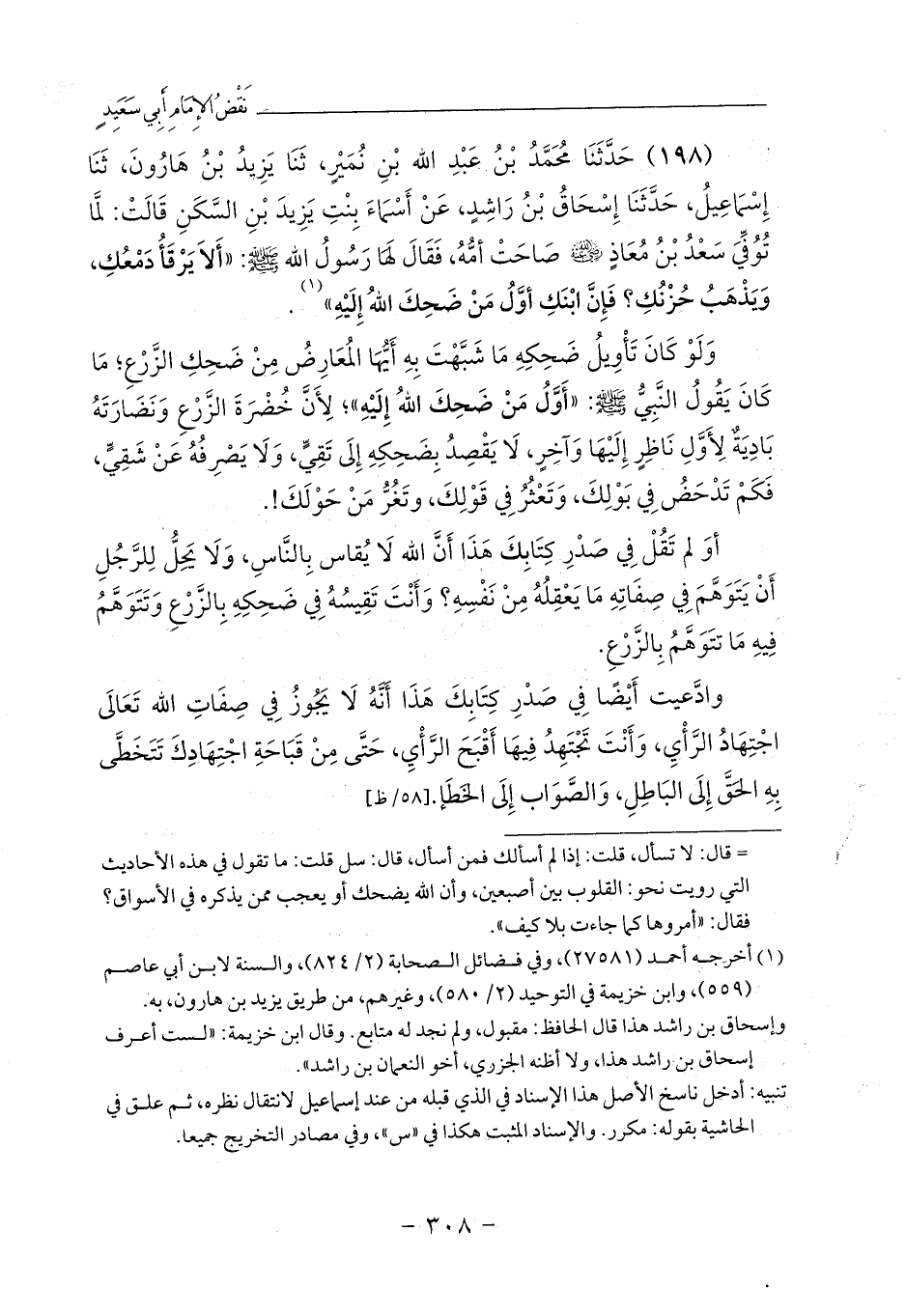 وادَّعيت أَيْضًا فِي صَدْرِ كِتَابِكَ هَذَا أَنَّهُ لَا يَجُوزُ فِي صِفَاتِ الله تَعَالَى اجْتِهَادُ الرَّأْيِ، وَأَنْتَ تَجْتَهِدُ فِيهَا أَقْبَحَ الرَّأْيِ، حَتَّى مِنْ قَبَاحَةِ اجْتِهَادِكَ تَتَخَطَّى بِهِ الحَقَّ إِلَى البَاطِلِ، وَالصَّوَاب إِلَى الخَطَإ. [58/ظ]
