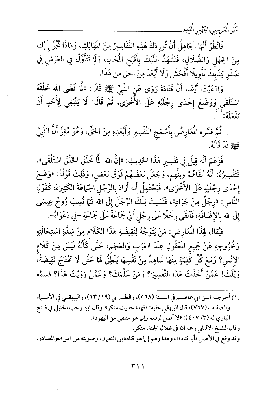 وَادَّعَيْتَ أَيْضًا أَنَّ قَتَادَةَ رَوَى عَنِ النَّبِيِّ - صلى الله عليه وسلم - قَالَ: «لَمَّا قَضَى الله خَلْقَهُ اسْتَلْقَى وَوَضَعَ إِحْدَى رِجْلَيْهِ عَلَى الأُخْرَى، ثُمَّ قَالَ: لَا يَنْبَغِي لِأَحَدٍ أَنْ يَفْعَلَهُ» (¬1).