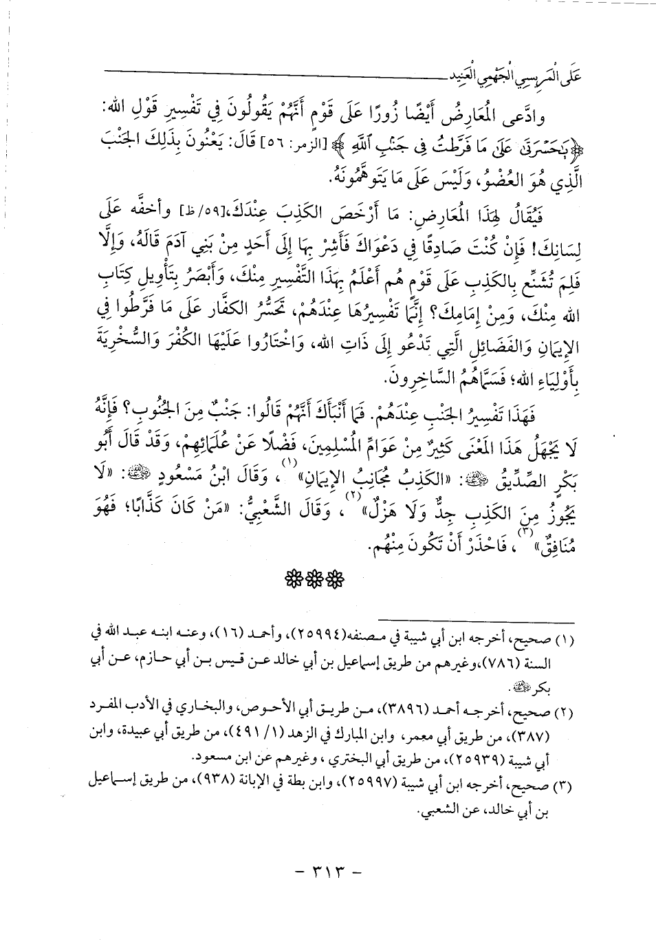 وادَّعى المُعَارِضُ أَيْضًا زُورًا عَلَى قَوْمٍ أَنَّهُمْ يَقُولُونَ فِي تَفْسِيرِ قَوْلِ الله: {يَاحَسْرَتَا عَلَى مَا فَرَّطْتُ فِي جَنْبِ اللَّهِ} [الزمر: 56] قَالَ: يَعْنُونَ بِذَلِكَ الجَنْبَ الَّذِي هُوَ العُضْوُ، وَلَيْسَ عَلَى مَا يَتَوهَّمُونَهُ.