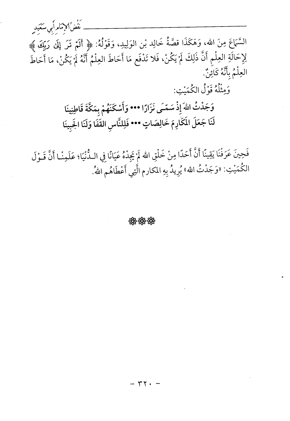فَحِينَ عَرَفْنَا يَقِينًا أَنَّ أَحَدًا مِنْ خَلْقِ الله لَمْ يَجِدْهُ عَيَانًا فِي الدُّنْيَا؛ عَلَمِنْا أَنَّ قَوْلَ الكُمَيْتِ: «وَجَدْتُ الله» يُرِيدُ بِهِ المكارم الَّتِي أَعْطَاهُم اللهُ.