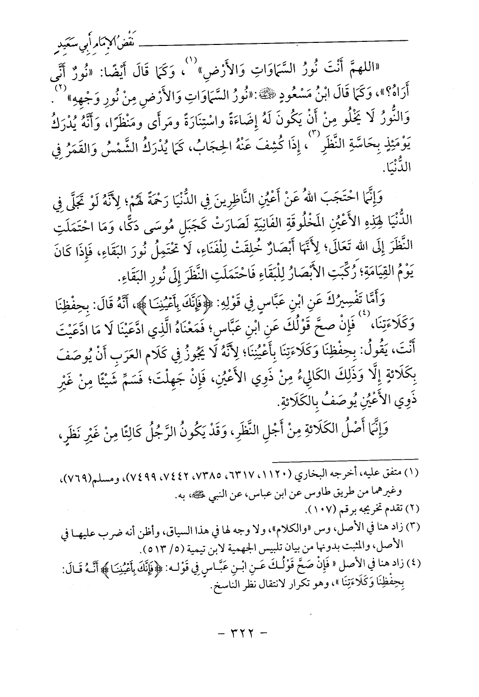 «اللهمَّ أَنْتَ نُورُ السَّمَاوَاتِ وَالأَرْضِ» (¬1)، وَكَمَا قَالَ أَيْضًا: «نُورٌ أَنَّى أَرَاهُ؟»، وَكَمَا قَالَ ابْنُ مَسْعُودٍ - رضي الله عنه -: «نُورُ السَّمَاوَاتِ وَالأَرْضِ مِنْ نُورِ وَجْهِهِ» (¬2). وَالنُّورُ لَا يَخْلُو مِنْ أَنْ يَكُونَ لَهُ إِضَاءَةً واسْتِنَارَةً ومَرأَى ومَنْظَرًا، وَأَنَّهُ يُدْرَكُ يَوْمَئِذٍ بِحَاسَّةِ النَّظَرِ (¬3)، إِذَا كُشِفَ عَنْهُ الحِجَابُ، كَمَا يُدْرَكُ الشَّمْسُ وَالقَمَرُ فِي الدُّنْيَا.