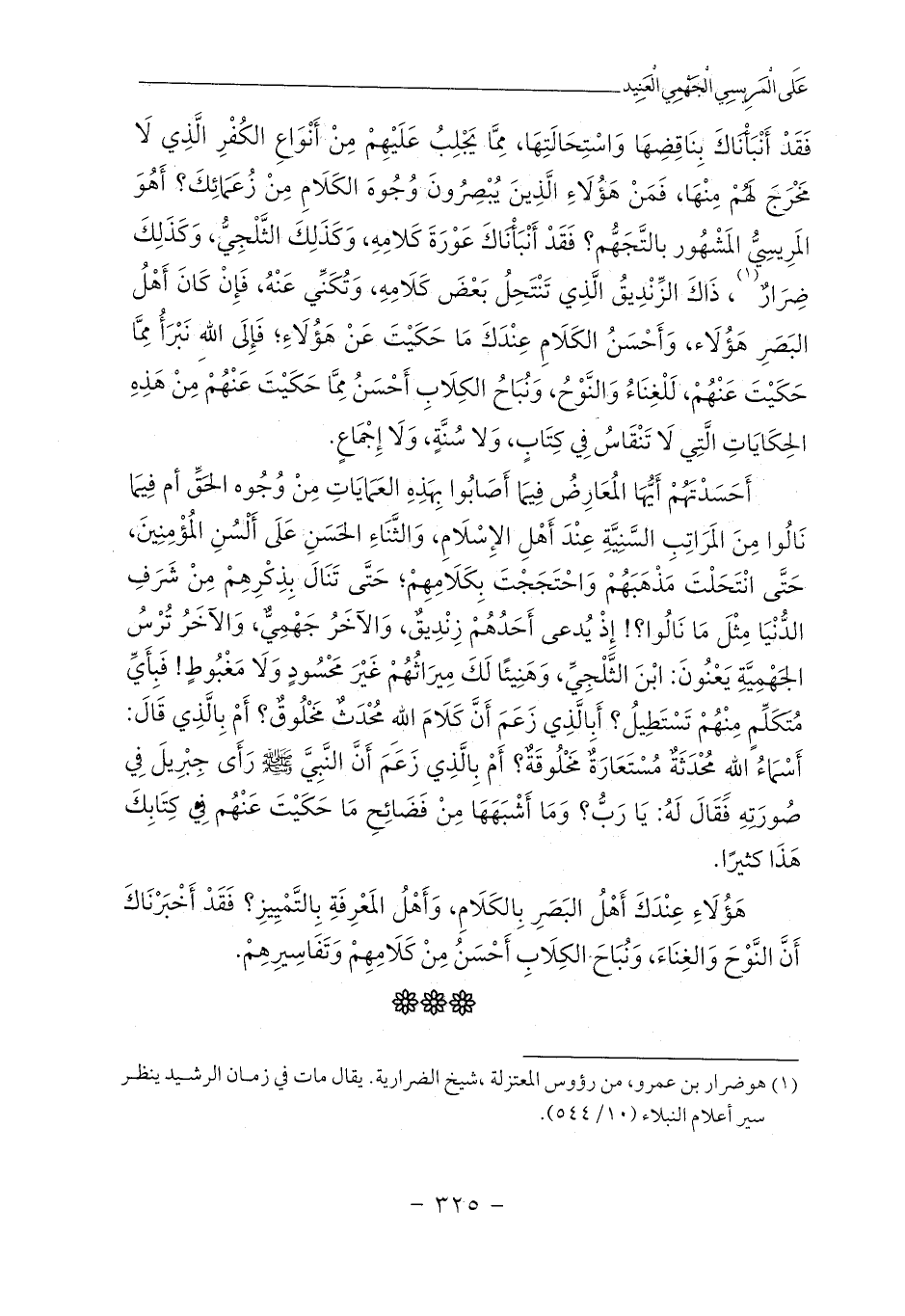 فَقَدْ أَنْبَأْنَاكَ بِنَاقِضِهَا وَاسْتِحَالَتِهَا، مِمَّا يَجْلِبُ عَلَيْهِمْ مِنْ أَنْوَاعِ الكُفْرِ الَّذِي لَا مَخْرَجَ لَهُمْ مِنْهَا، فَمَنْ هَؤُلَاءِ الَّذِينَ يُبْصِرُونَ وُجُوهَ الكَلَامِ مِنْ زُعَمَائِكَ؟ أَهُوَ المَرِيسِيُّ المَشْهُور بالتَّجَهُّم؟ فَقَدْ أَنْبَأْنَاكَ عَوْرَةَ كَلامِهِ، وَكَذَلِكَ الثَّلْجِيُّ، وَكَذَلِكَ ضِرَارٌ (¬1)،