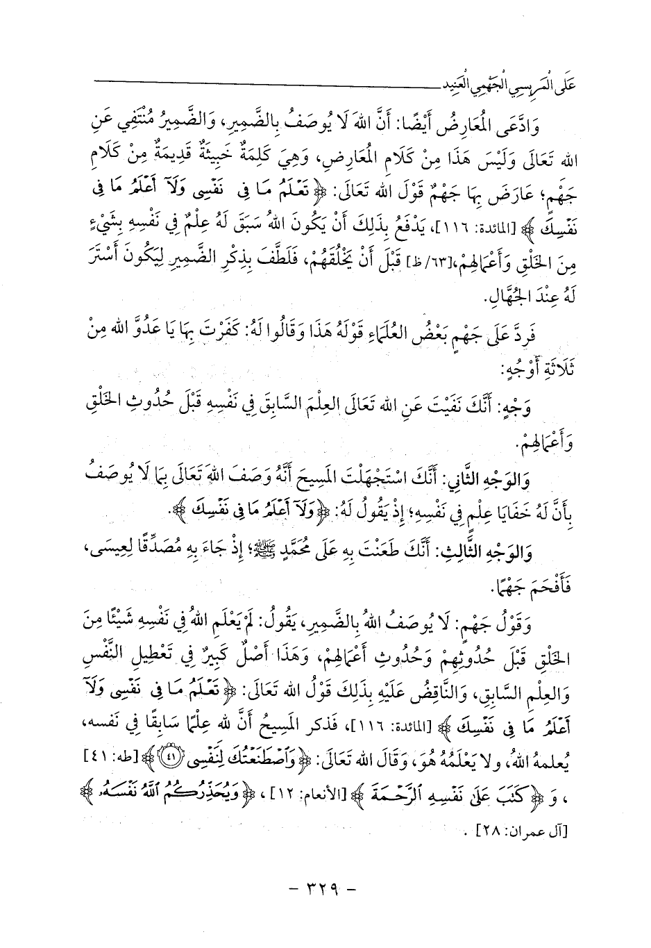 وَقَوْلُ جَهْمٍ: لَا يُوصَفُ اللهُ بِالضَّمِيرِ، يَقُولُ: لَمْ يَعْلَمِ اللهُ فِي نَفْسِهِ شَيْئًا مِنَ الخَلْقِ قَبْلَ حُدُوثِهِمْ وَحُدُوثِ أَعْمَالِهِمْ، وَهَذَا أَصْلٌ كَبِيرٌ فِي تَعْطِيلِ النَّفْسِ وَالعِلْمِ السَّابِقِ، وَالنَّاقِضُ عَلَيْهِ بِذَلِكَ قَوْلُ الله تَعَالَى: {تَعْلَمُ مَا فِي نَفْسِي وَلَا أَعْلَمُ مَا فِي نَفْسِكَ} [المائدة: 116]، فَذكر المَسِيحُ أَنَّ للهِ عِلْمًا سَابِقًا فِي نَفسه، يُعلمهُ اللهُ، ولا يَعْلَمُهُ هُوَ، وَقَالَ الله تَعَالَى: {وَاصْطَنَعْتُكَ لِنَفْسِي (41)} [طه: 41]، وَ {كَتَبَ عَلَى نَفْسِهِ الرَّحْمَةَ} [الأنعام: 12]، {وَيُحَذِّرُكُمُ اللَّهُ نَفْسَهُ} [آل عمران: 28].