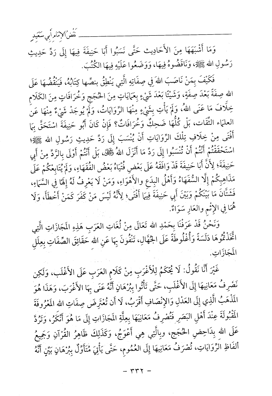 فَكَيْفَ بِمَنْ نَاصَبَ اللهَ فِي صِفَاتِهِ الَّتِي يَنْطِقُ بنصِّها كِتَابُهُ، فَيَنْقُضُهَا عَلَى اللهِ صِفَةً بَعْدَ صِفَةٍ، وَشَيْئًا بَعْدَ شَيْءٍ بِعَمَايَاتٍ مِنَ الحُجَجِ وَخُرَافَاتٍ مِنَ الكَلَامِ خِلَافَ مَا عَنَى اللهُ، وَلَمْ يَأْتِ بِشَيْءٍ مِنْهَا الرِّوَايَاتُ، وَلَمْ يُوجَدْ شَيْءٌ مِنْهَا عَن العلمَاء الثِّقَات، بَلْ كُلُّهَا ضَحِكٌ وَخُرَافَاتٌ؟ فَإِنْ كَانَ أَبُو حَنِيفَةَ اسْتَحَقَّ بِمَا أَفْتَى مِنْ خِلَافِ تِلْكَ الرِّوَايَاتِ أَنْ يُنْسَبَ إِلَى رَدِّ حَدِيثِ رَسُولِ الله - صلى الله عليه وسلم -؛ اسْتَحْقَقْتُمْ أَنْتُمْ أَنْ تُنْسَبُوا إِلَى رَدِّ مَا أَنْزَلَ اللهُ - عز وجل -، بَلْ أَنْتُمْ أَوْلَى بِالرَّدِّ مِنْ أَبِي حَنِيفَةَ؛ لِأَنَّ أَبَا حَنِيفَةَ قَدْ وَافَقَهُ عَلَى بَعْضِ فُتْيَاهُ بَعْضُ الفُقَهَاءِ، وَلَمْ يُتَابِعْكُمْ عَلَى مَذَاهِبِكُمْ إِلَّا السُّفَهَاءُ وَأَهْلُ البِدَعِ والأَهْوَاءِ، وَمَنْ لَا يَعْرِفُ لَهُ إِلَهًا فِي السَّمَاءِ، فَشَتَّانَ مَا بَيْنَكُمْ وَبَيْنَ أَبِي حَنِيفَةَ فِيمَا أَفْتَى؛ لِأَنَّهُ لَيْسَ مَنْ كَفَرَ كَمَنْ أَخْطَأَ، وَلَا هُمَا فِي الإِثْمِ والعَارِ سَوَاءٌ.