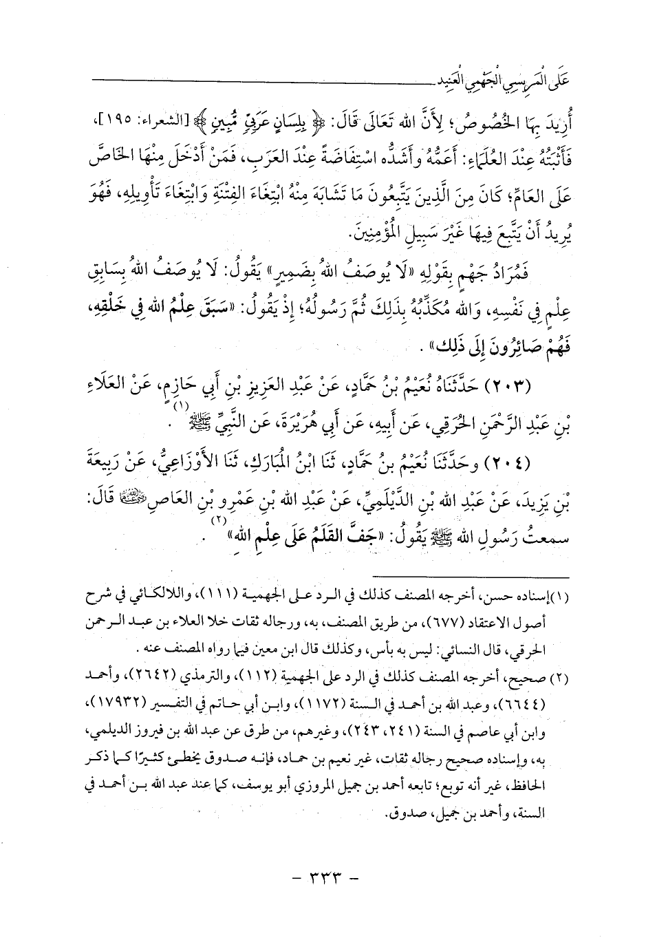 (204) وحَدَّثَنَا نُعَيْمُ بنُ حَمَّادٍ، ثَنَا ابْنُ المُبَارَكِ، ثَنَا الأَوْزَاعِيُّ، عَنْ رَبِيعَةَ بْنِ يَزِيدَ، عَنْ عَبْدِ الله بْنِ الدَّيْلَمِيِّ، عَنْ عَبْدِ الله بْنِ عَمْرِو بْنِ العَاصِ - رضي الله عنهما - قَالَ: سمعتُ رَسُولِ الله - صلى الله عليه وسلم - يَقُولُ: «جَفَّ القَلَمُ عَلَى عِلْمِ اللهِ» (¬2).