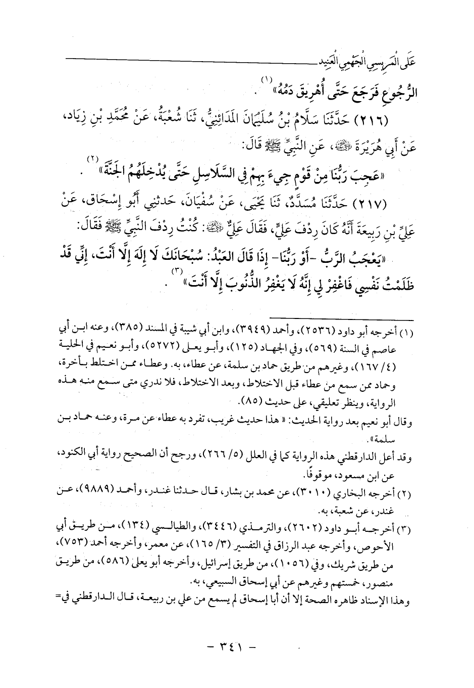 (217) حَدَّثَنَا مُسَدَّدٌ، ثَنَا يَحْيَى، عَنْ سُفْيَانَ، حَدثنِي أَبُو إِسْحَاق، عَنْ عَلِيِّ بْنِ رَبِيعَةَ أَنَّهُ كَانَ رِدْفَ عَلِيٍّ، فَقَالَ عَلِيٌّ - رضي الله عنه -: كُنْتُ رِدْفَ النَّبِيِّ - صلى الله عليه وسلم - فَقَالَ:
