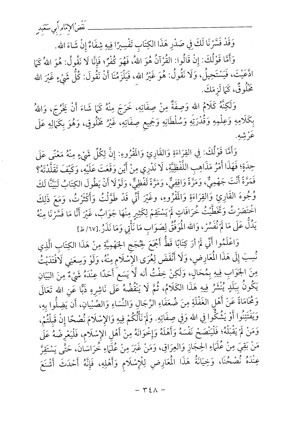 وَاعْلَمُوا أَنِّي لَمْ أرَ كِتَابًا قَطُّ أَجْمَعَ لِحُجَجِ الجَهْمِيَّةِ مِنْ هَذَا الكِتَابِ الَّذِي نُسِبَ إِلَى هَذَا المُعَارِضِ، وَلَا أَنْقَضَ لِعُرَى الإِسْلَامِ مِنْهُ، وَلَوْ وَسِعَنِي لَافْتَدَيْتُ مِنَ الجَوَابِ فِيهِ بِمُحَالٍ، وَلَكِنْ خِفْتُ أَنه لَّا يَسَع أَحَدًا عِنْدَهُ شَيْءٌ مِنَ البَيَانِ يَكُونُ بِبَلَدٍ يُنْشَرُ فِيهِ هَذَا الكَلَامُ، ثُمَّ لَا يَنْقُضُهُ عَلَى نَاشِرِهِ ذَبًّا عَنِ الله تَعَالَى وَمُحَامَاةً عَنْ أَهْلِ الغَفْلَةِ مِنَ ضُعَفَاءِ الرِّجَالِ وَالنِّسَاءِ وَالصِّبْيانِ، أَن يَضِلُّوا بِهِ، وَيَفْتَتِنُوا أَوْ يَشُكُّوا فِي الله وَفِي صِفَاتِهِ. وَلَمْ نَأْلُكُمْ فِيهِ وَالإِسْلَامَ نُصْحًا إِنْ قَبِلْتُمْ، وَمَنْ لَمْ يَقْبَلْهُ؛ فَلْيَنْصَحْ نَفْسَهُ وَأَهْلَهُ وَإِخْوَانَهُ مِنْ أَهْلِ الإِسْلَامِ، فَلْيَعْرِضْهُ عَلَى مَنْ بَقِيَ مِنْ عُلَمَاءِ الحِجَازِ وَالعِرَاقِ، وَمَنْ غَبَرَ مِنْ عُلَمَاءِ خُرَاسَانَ، حَتَّى يَسْتَقِرَّ عِنْدَهُ نُصْحُنَا، وَخِيَانَةُ هَذَا المُعَارِضِ لِلْإِسْلَامِ وَأَهْلِهِ، فَإِنَّهُ أَحْدَثَ أَشْنَعَ