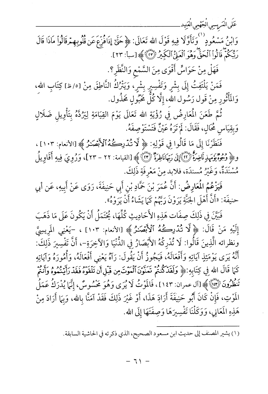 فَبَيَّنَ فِي ذَلِكَ صِفَات هَذِهِ الأَحَادِيثِ كُلِّهَا، يُحْتَمَلُ أَنْ يَكُونَ عَلَى مَا ذَهَبَ إِلَيْهِ مَنْ قَالَ: {لَا تُدْرِكُهُ الْأَبْصَارُ} [الأنعام: 103]، -يَعْنِي المَرِيسِيَّ ونظرائه الَّذِينَ قَالُوا: لَا تُدْرِكُهُ الأَبْصَارُ فِي الدُّنْيَا وَالآخِرَةِ-، أَنَّ تَفْسِيرَ ذَلِكَ: أَنَّهُ يَرَى يَوْمَئِذٍ آيَاتِهِ وَأَفْعَالَهُ، فَيَجُوزُ أَنْ يَقُولَ: رَآهُ يَعْنِي أَفْعَالَهُ، وَأُمُورَهُ وَآيَاتِهِ كَمَا قَالَ الله فِي كِتَابِهِ: {وَلَقَدْ كُنْتُمْ تَمَنَّوْنَ الْمَوْتَ مِنْ قَبْلِ أَنْ تَلْقَوْهُ فَقَدْ رَأَيْتُمُوهُ وَأَنْتُمْ تَنْظُرُونَ (143)} [آل عمران: 143]، فَالمَوْتُ لَا يُرَى وَهُوَ مَحْسُوسٌ، إِنَّمَا يُدْرَكُ عَمَلُ المَوْتِ، فَإِنْ كَانَ أَبُو حَنِيفَةَ أَرَادَ هَذَا، أَوْ غَيْرَ ذَلِكَ فَقَدْ آمَنَّا بِالله، وَبِمَا أَرَادَ مِنْ هَذِهِ المَعَانِي، وَوَكَلْنَا تَفْسِيرَهَا وَصِفَتَهَا إِلَى الله.