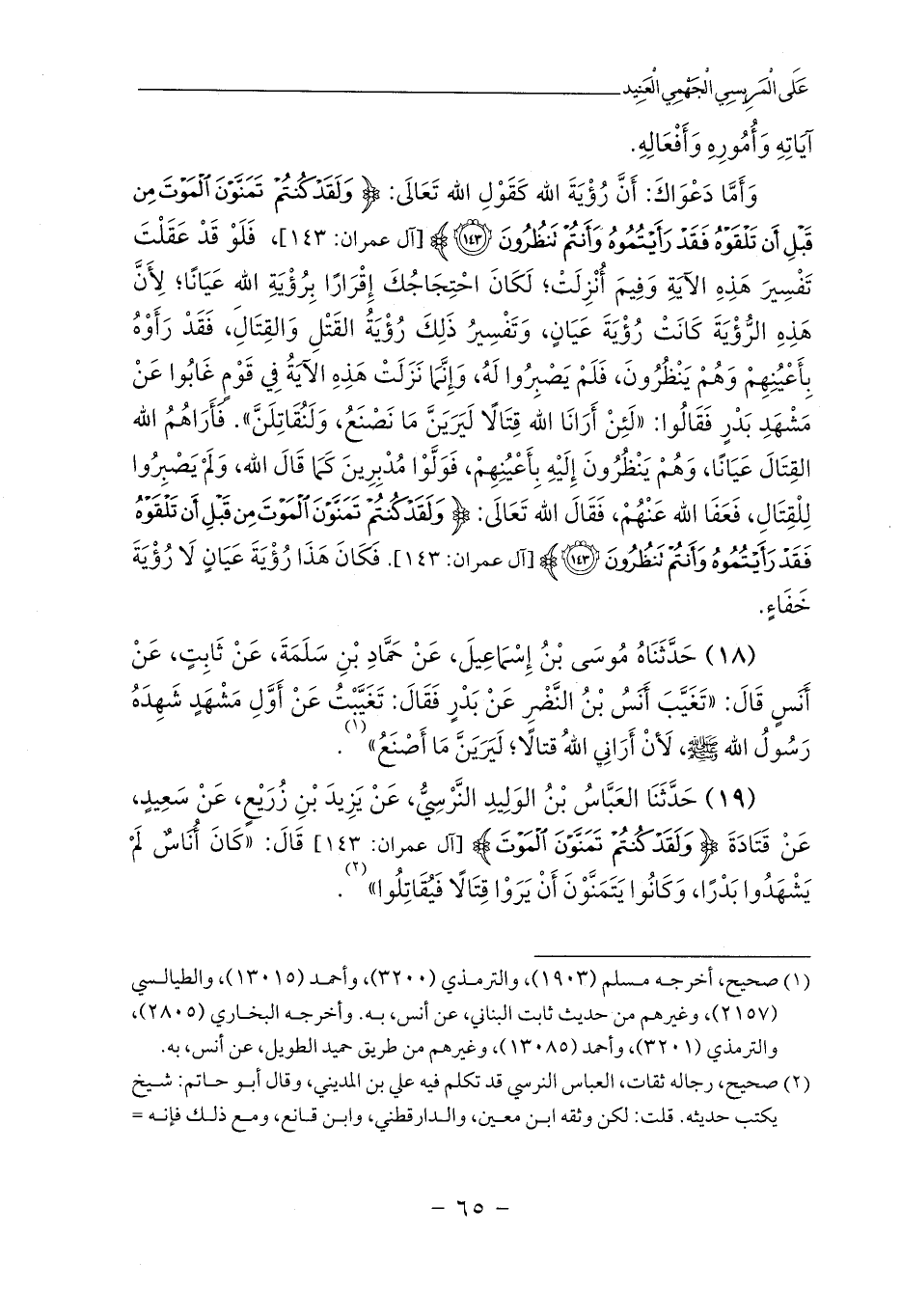 وَأَمَّا دَعْوَاكَ: أَنَّ رُؤْيَةَ الله كَقَوْلِ الله تَعَالَى: {وَلَقَدْ كُنْتُمْ تَمَنَّوْنَ الْمَوْتَ مِنْ قَبْلِ أَنْ تَلْقَوْهُ فَقَدْ رَأَيْتُمُوهُ وَأَنْتُمْ تَنْظُرُونَ (143)} [آل عمران: 143]، فَلَوْ قَدْ عَقَلْتَ تَفْسِيرَ هَذِهِ الآيَةِ وَفِيمَ أُنْزِلَتْ؛ لَكَانَ احْتِجَاجُكَ إِقْرَارًا بِرُؤْيَةِ اللهِ عَيَانًا؛ لِأَنَّ هَذِهِ الرُّؤْيَةَ كَانَتْ رُؤْيَةَ عَيَانٍ، وَتَفْسِيرُ ذَلِكَ رُؤْيَةُ القَتْلِ وَالقِتَالِ، فَقَدْ رَأَوْهُ بِأَعْيُنِهِمْ وَهُمْ يَنْظُرُونَ، فَلَمْ يَصْبِرُوا لَهُ، وَإِنَّمَا نَزَلَتْ هَذِهِ الآيَةُ فِي قَوْمٍ غَابُوا عَنْ مَشْهَدِ بَدْرٍ فَقَالُوا: «لَئِنْ أَرَانَا الله قِتَالًا لَيَرَيَنَّ مَا نَصْنَعُ، وَلَنُقَاتِلَنَّ». فَأَرَاهُمُ الله القِتَالَ عَيَانًا، وَهُمْ يَنْظُرُونَ إِلَيْهِ بِأَعْيُنِهِمْ، فَوَلَّوْا مُدْبِرِينَ كَمَا قَالَ الله، وَلَمْ يَصْبِرُوا لِلْقِتَالِ، فَعَفَا الله عَنْهُمْ، فَقَالَ الله تَعَالَى: {وَلَقَدْ كُنْتُمْ تَمَنَّوْنَ الْمَوْتَ مِنْ قَبْلِ أَنْ تَلْقَوْهُ فَقَدْ رَأَيْتُمُوهُ وَأَنْتُمْ تَنْظُرُونَ (143)} [آل عمران: 143]. فَكَانَ هَذَا رُؤْيَةَ عَيَانٍ لَا رُؤْيَةَ خَفَاءٍ.