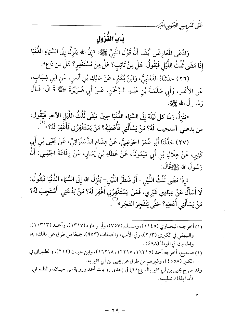 وَادَّعَى المُعَارِضُ أَيْضًا أَنَّ قَوْلَ النَّبِيِّ - صلى الله عليه وسلم -: «إِنَّ الله يَنْزِلُ إِلَى السَّمَاءِ الدُّنْيَا إِذَا مَضَى ثُلُثُ اللَّيْلِ فَيَقُولُ: هَلْ مِنْ تَائِبٍ؟ هَلْ مِنْ مُسْتَغْفِرٍ؟ هَلْ من دَاع».