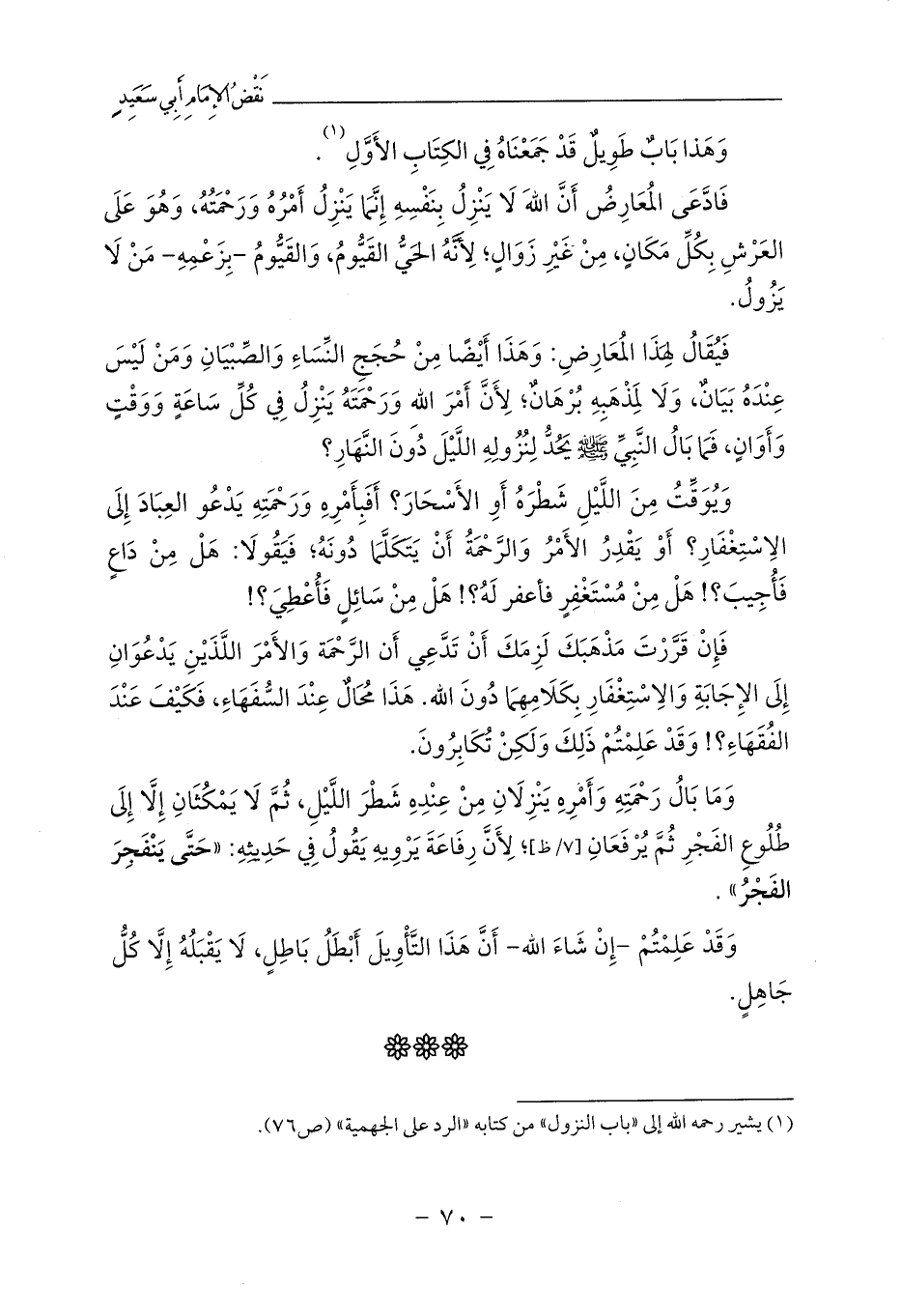 (¬1) يشير رحمه الله إلى «باب النزول» من كتابه «الرد على الجهمية» (ص 76).