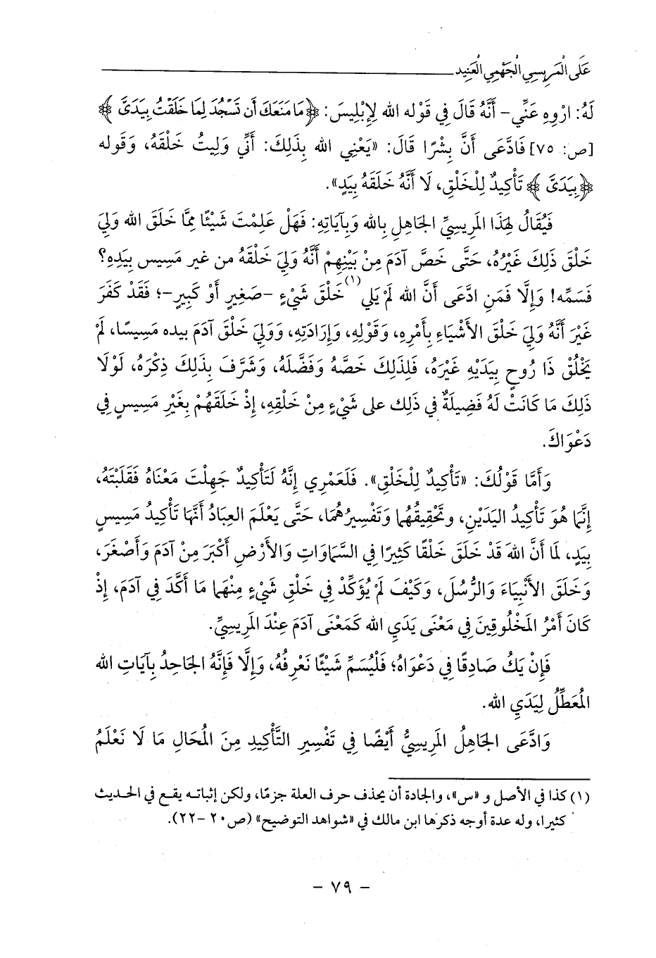 وَأَمَّا قَوْلُكَ: «تَأْكِيدٌ لِلْخَلْقِ». فَلَعَمْرِي إِنَّهُ لَتَأْكِيدٌ جَهِلْتَ مَعْنَاهُ فَقَلَبْتَهُ، إِنَّمَا هُوَ تَأْكِيدُ اليَدَيْنِ، وتَحْقِيقُهُما وَتَفْسِيرُهُمَا، حَتَّى يَعْلَمَ العِبَادُ أَنَّهَا تَأْكِيدُ مَسِيسٍ بِيَدٍ، لَما أَنَّ اللهَ قَدْ خَلَقَ خَلْقًا كَثِيرًا فِي السَّمَاوَاتِ وَالأَرْضِ أَكْبَرَ مِنْ آدَمَ وَأَصْغَرَ، وَخَلَقَ الأَنْبِيَاءَ وَالرُّسُلَ، وَكَيْفَ لَمْ يُؤَكِّدْ فِي خَلْقِ شَيْءٍ مِنْهَما مَا أَكَّدَ فِي آدَمَ، إِذْ كَانَ أَمْرُ المَخْلُوقِينَ فِي مَعْنَى يَدَيِ الله كَمَعْنَى آدَمَ عِنْدَ المَرِيسِيِّ.