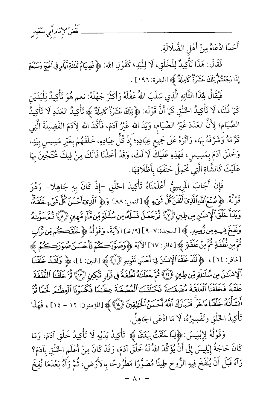 قَوْلُهُ: {صُنْعَ اللَّهِ الَّذِي أَتْقَنَ كُلَّ شَيْءٍ} [النمل: 88] وَ {الَّذِي أَحْسَنَ كُلَّ شَيْءٍ خَلَقَهُ وَبَدَأَ خَلْقَ الْإِنْسَانِ مِنْ طِينٍ (7) ثُمَّ جَعَلَ نَسْلَهُ مِنْ سُلَالَةٍ مِنْ مَاءٍ مَهِينٍ (8) ثُمَّ سَوَّاهُ وَنَفَخَ فِيهِ مِنْ رُوحِهِ} [السجدة:7 - 9] [9/ظ] الآيَةَ، وَقَوْلُهُ {خَلَقَكُمْ مِنْ تُرَابٍ ثُمَّ مِنْ نُطْفَةٍ ثُمَّ مِنْ عَلَقَةٍ} [غافر: 67] الآيَة {وَصَوَّرَكُمْ فَأَحْسَنَ صُوَرَكُمْ} [غافر: 64]، {لَقَدْ خَلَقْنَا الْإِنْسَانَ فِي أَحْسَنِ تَقْوِيمٍ (4)} [التين: 4]، {وَلَقَدْ خَلَقْنَا الْإِنْسَانَ مِنْ سُلَالَةٍ مِنْ طِينٍ (12) ثُمَّ جَعَلْنَاهُ نُطْفَةً فِي قَرَارٍ مَكِينٍ (13) ثُمَّ خَلَقْنَا النُّطْفَةَ عَلَقَةً فَخَلَقْنَا الْعَلَقَةَ مُضْغَةً فَخَلَقْنَا الْمُضْغَةَ عِظَامًا فَكَسَوْنَا الْعِظَامَ لَحْمًا ثُمَّ أَنْشَأْنَاهُ خَلْقًا آخَرَ فَتَبَارَكَ اللَّهُ أَحْسَنُ الْخَالِقِينَ (14)} [المؤمنون: 12 - 14]، فَهَذَا تَأْكِيدُ الخَلْقِ وتَفْسِيرُهُ، لَا مَا ادَّعَى الجَاهِلُ.