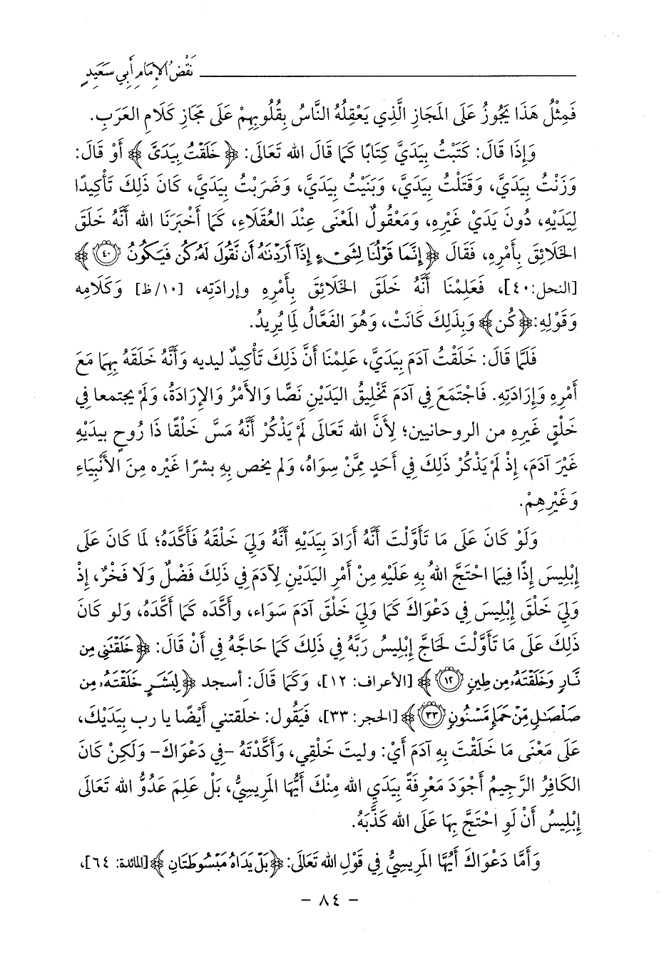 وَإِذَا قَالَ: كَتَبْتُ بِيَدَيَّ كِتَابًا كَمَا قَالَ الله تَعَالَى: {خَلَقْتُ بِيَدَيَّ} أَوْ قَالَ: وَزَنْتُ بِيَدَيَّ، وَقَتَلْتُ بِيَدَيَّ، وَبَنَيْتُ بِيَدَيَّ، وَضَرَبْتُ بِيَدَيَّ، كَانَ ذَلِكَ تَأْكِيدًا لِيَدَيْهِ، دُونَ يَدَيْ غَيْرِهِ، وَمَعْقُولٌ المَعْنَى عِنْدَ العُقَلَاءِ، كَمَا أَخْبَرَنَا الله أَنَّهُ خَلَقَ الخَلَائِقَ بِأَمْرِهِ، فَقَالَ {إِنَّمَا قَوْلُنَا لِشَيْءٍ إِذَا أَرَدْنَاهُ أَنْ نَقُولَ لَهُ كُنْ فَيَكُونُ (40)} [النحل:40]، فَعَلِمْنَا أَنَّهُ خَلَقَ الخَلَائِقَ بِأَمْرِهِ وإرادَتِه، [10/ظ] وَكَلَامِه وَقَوْلِهِ: {كُن} وَبِذَلِكَ كَانَتْ، وَهُوَ الفَعَّالُ لِمَا يُرِيدُ.