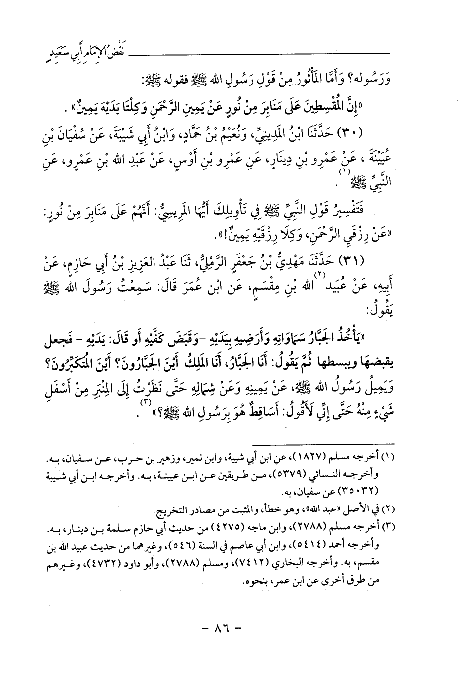 «إِنَّ المُقْسِطِينَ عَلَى مَنَابِرَ مِنْ نُورٍ عَنْ يَمِينِ الرَّحْمَنِ وَكِلْتَا يَدَيْهَ يَمِينٌ».