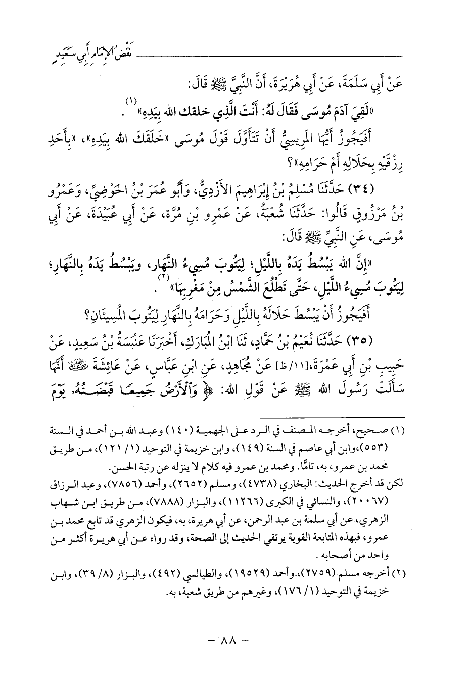(¬1) صحيح، أخرجه المصنف في الرد على الجهمية (140) وعبد الله بن أحمد في السنة (553)،وابن أبي عاصم في السنة (149)، وابن خزيمة في التوحيد (1/ 121)، من طريق محمد بن عمرو، به، تامًّا. ومحمد بن عمرو فيه كلام لا ينزله عن رتبة الحسن.