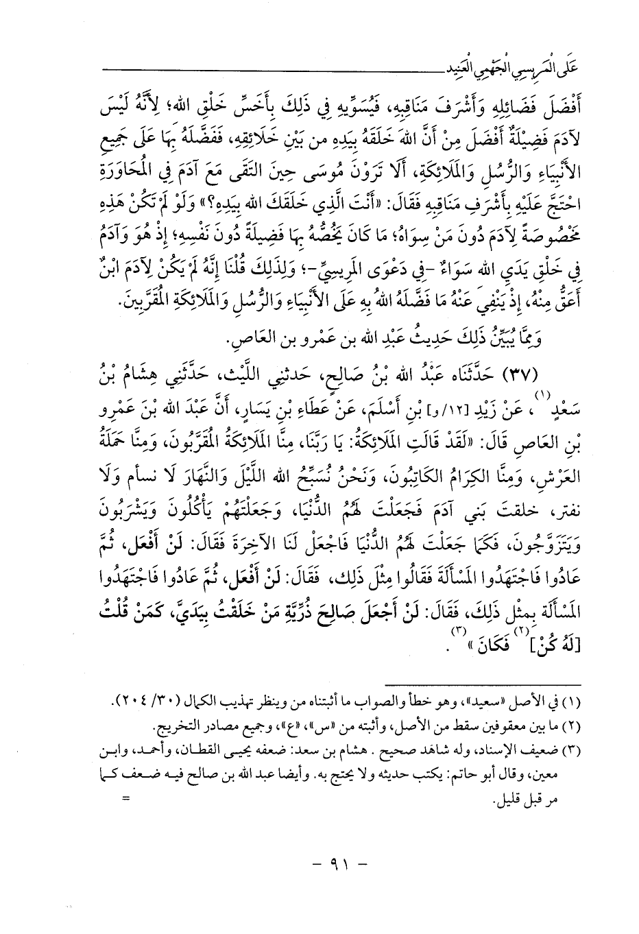 (37) حَدَّثَنَاه عَبْدُ الله بْنُ صَالِحٍ، حَدثنِي اللَّيْث، حَدَّثَنِي هِشَامُ بْنُ سَعْدٍ (¬1)، عَنْ زَيْدِ [12/و] بْنِ أَسْلَمَ، عَنْ عَطَاءِ بْنِ يَسَارٍ، أَنَّ عَبْدَ الله بْنَ عَمْرِو بْنِ العَاصِ قَالَ: «لَقَدْ قَالَتِ المَلَائِكَةُ: يَا رَبَّنَا، مِنَّا المَلَائِكَةُ المُقَرَّبُونَ، وَمِنَّا حَمَلَةُ العَرْشِ، وَمِنَّا الكِرَامُ الكَاتِبُونَ، وَنَحْنُ نُسَبِّحُ الله اللَّيْلَ وَالنَّهَارَ لَا نسأم وَلَا نفتر، خلقتَ بَني آدَمَ فَجَعَلْتَ لَهُمُ الدُّنْيَا، وَجَعَلْتَهُمْ يَأْكُلُونَ وَيَشْرَبُونَ وَيَتَزَوَّجُونَ، فَكَمَا جَعَلْتَ لَهُمُ الدُّنْيَا فَاجْعَلْ لَنَا الآخِرَةَ فَقَالَ: لَنْ أَفْعَل، ثُمَّ عَادُوا فَاجْتَهَدُوا المَسْأَلَةَ فَقَالُوا مِثْلَ ذَلِك، فَقَالَ: لَنْ أَفْعَل، ثُمَّ عَادُوا فَاجْتَهَدُوا المَسْأَلَة بِمثْل ذَلِكَ، فَقَالَ: لَنْ أَجْعَلَ صَالِحَ ذُرِّيَّةِ مَنْ خَلَقْتُ بِيَدَيَّ، كَمَنْ قُلْتُ [لَهُ كُنْ] (¬2) فَكَانَ» (¬3).