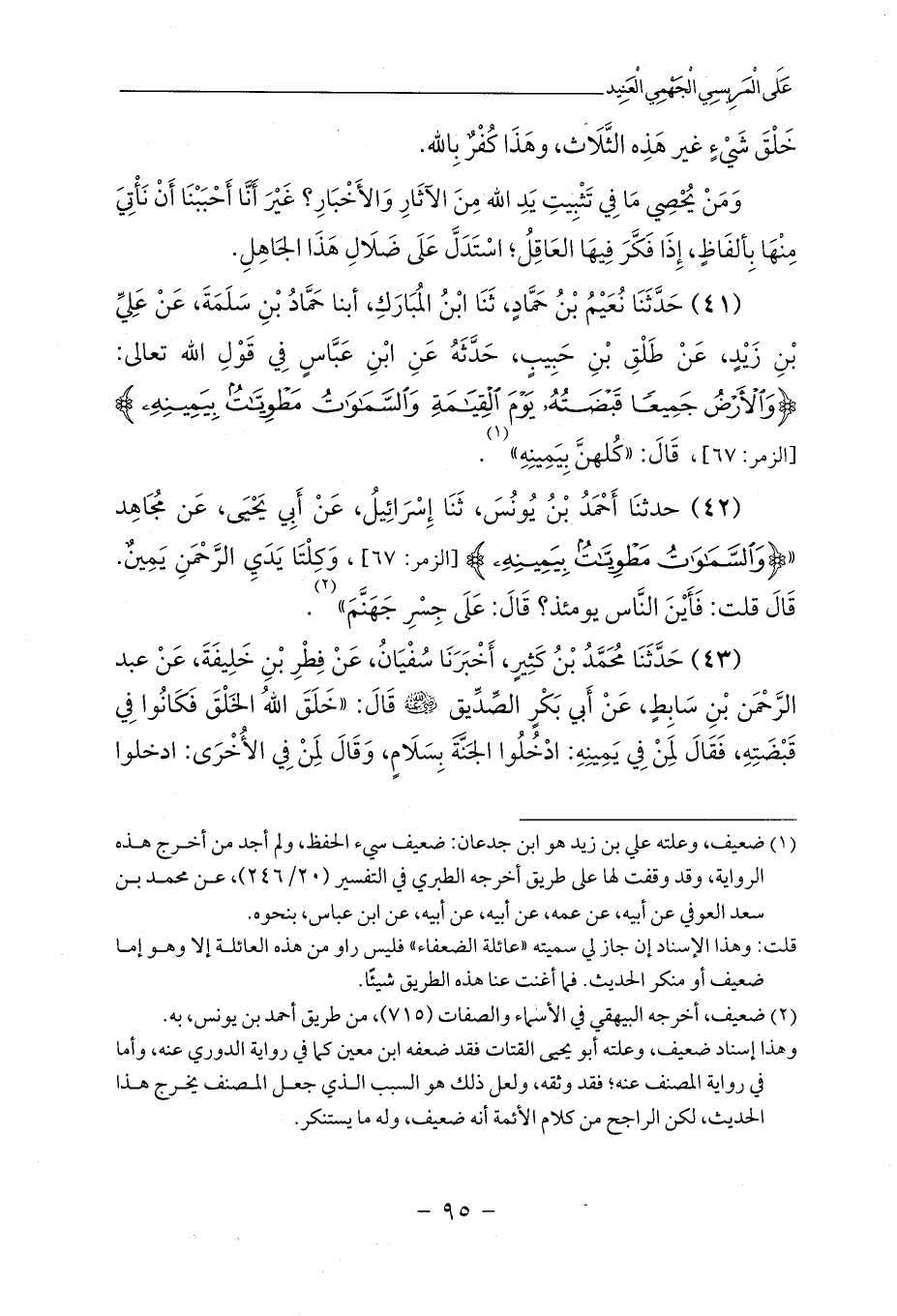 (41) حَدَّثَنَا نُعَيْمُ بْنُ حَمَّادٍ، ثَنَا ابْنُ المُبَارَكِ، أبنا حَمَّادُ بْنِ سَلَمَةَ، عَنْ عَلِيِّ بْنِ زَيْدٍ، عَنْ طَلْقِ بْنِ حَبِيبٍ، حَدَّثَهُ عَنِ ابْنِ عَبَّاسٍ فِي قَوْلِ الله تعالى: {وَالْأَرْضُ جَمِيعًا قَبْضَتُهُ يَوْمَ الْقِيَامَةِ وَالسَّمَاوَاتُ مَطْوِيَّاتٌ بِيَمِينِهِ} [الزمر: 67]، قَالَ: «كُلهنَّ بِيَمِينِهِ» (¬1).
